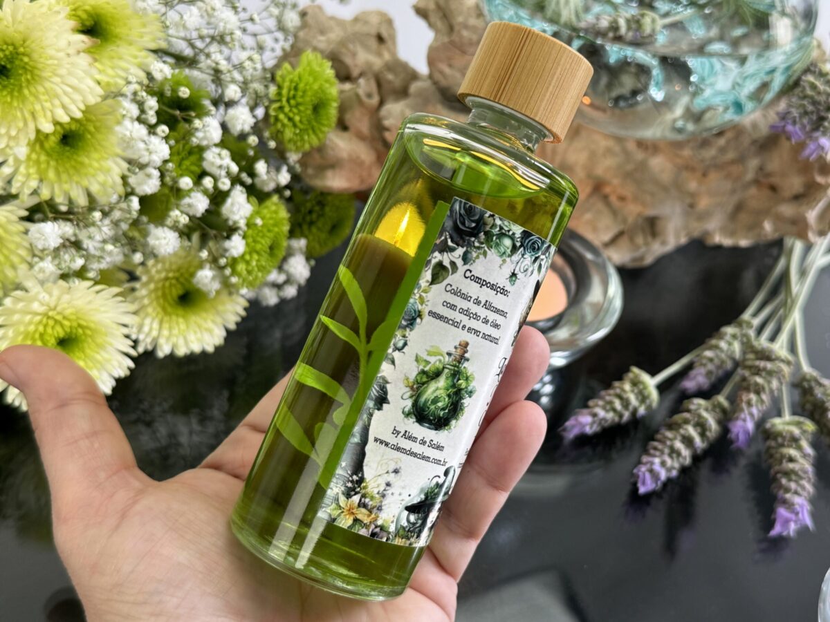 - Base em colônia de alfazema P&G manipulada com erva (arruda) natural e óleos essenciais de Lavanda Francesa, Verbena, Capim-Limão e Alecrim.