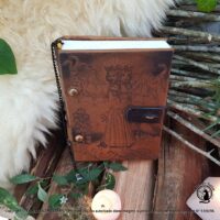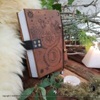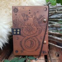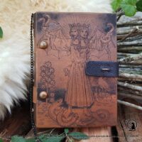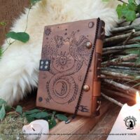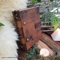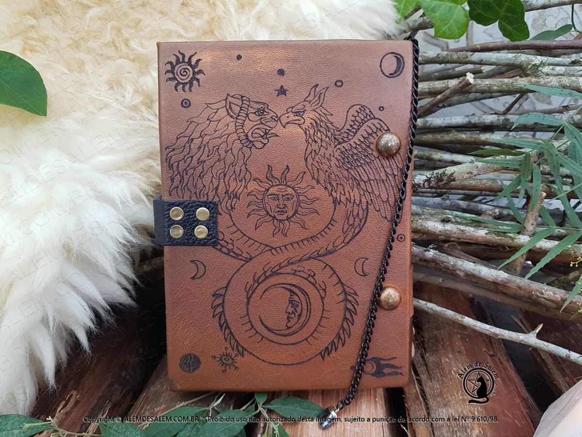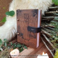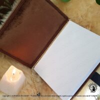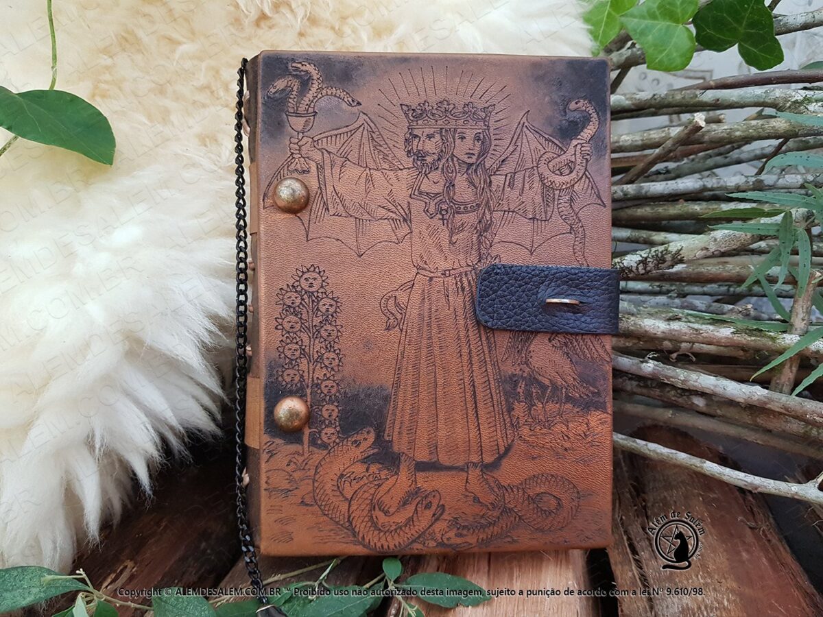 Livro das Sombras Grimório Alchemy Duos Caputis, esse exemplar e exclusivo totalmente confeccionado conforme os costumes pagãos tradicionais. Em couro natural, sua costura em técnica medieval e riqueza nos detalhes, fazem deste exemplar uma peça única.