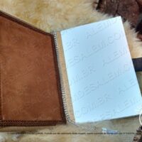 - Capa e contra-capa de madeira, revestidas em couro legítimo, trabalhadas com gravação manual em pirografia. Partes internas forradas em couro de cabra.