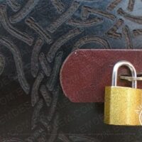 - Capa e contra-capa de madeira, revestidas em couro legítimo, trabalhadas com gravação manual em pirografia. Partes internas forradas em couro de cabra.