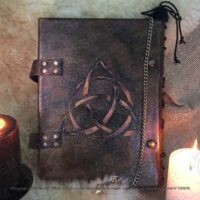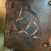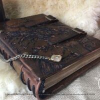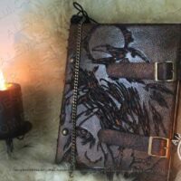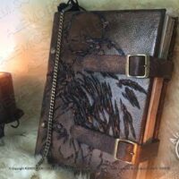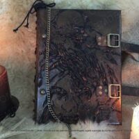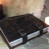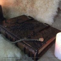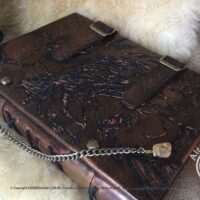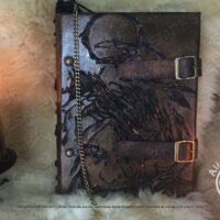 Livro com capa de madeira e forração dupla de couro legítimo, pirografado manualmente, com acabamento em pintura envelhecida na cor cobre. Uma obra de arte para aqueles que buscam eternizar suas memórias, práticas, e estudos da antiga arte.