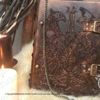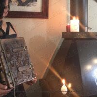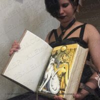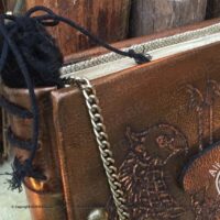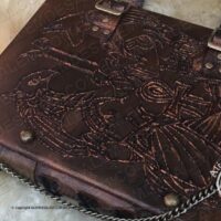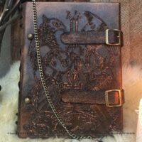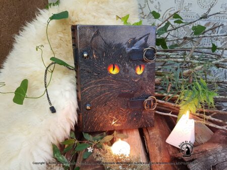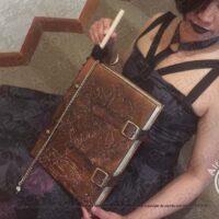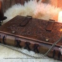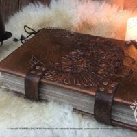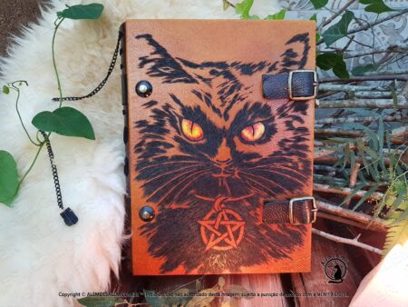 Livro com capa de madeira e forração dupla de couro legítimo, pirografado manualmente, com acabamento em pintura envelhecida na cor cobre. Uma obra de arte para aqueles que buscam eternizar suas memórias, práticas, e estudos da antiga arte.