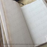 - Capa e contra-capa de madeira, revestidas duplamente em couro legítimo, trabalhadas com gravação manual em pirografia.