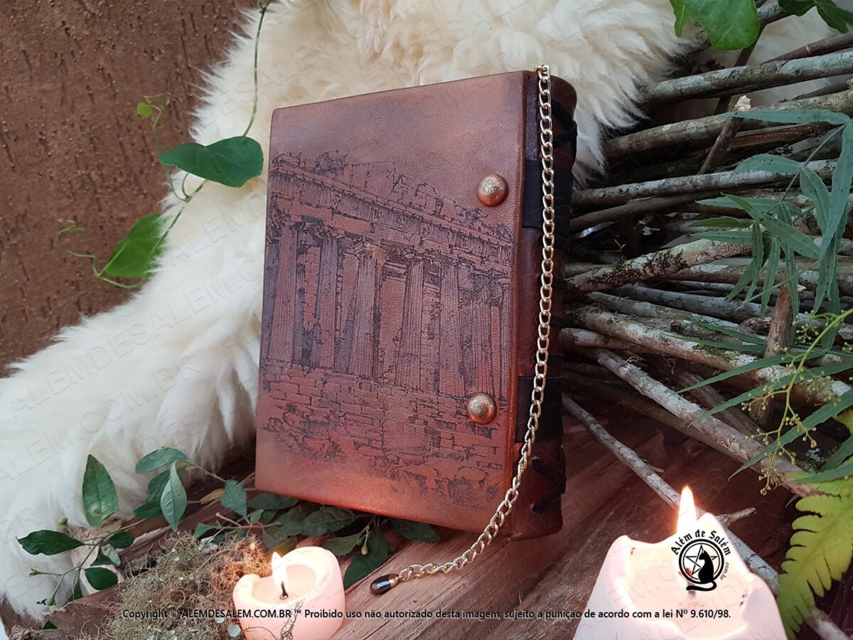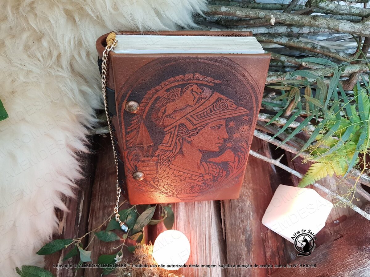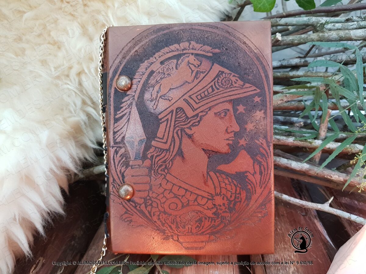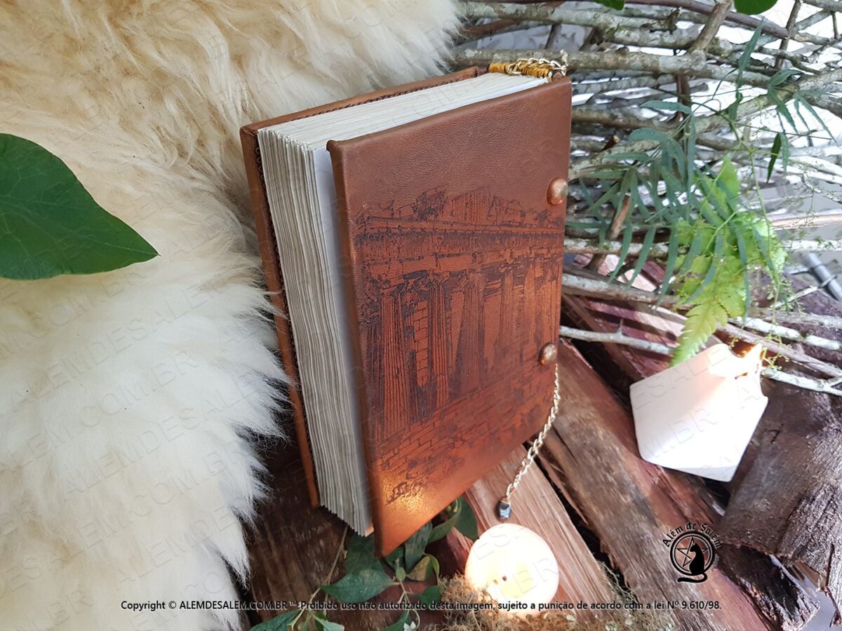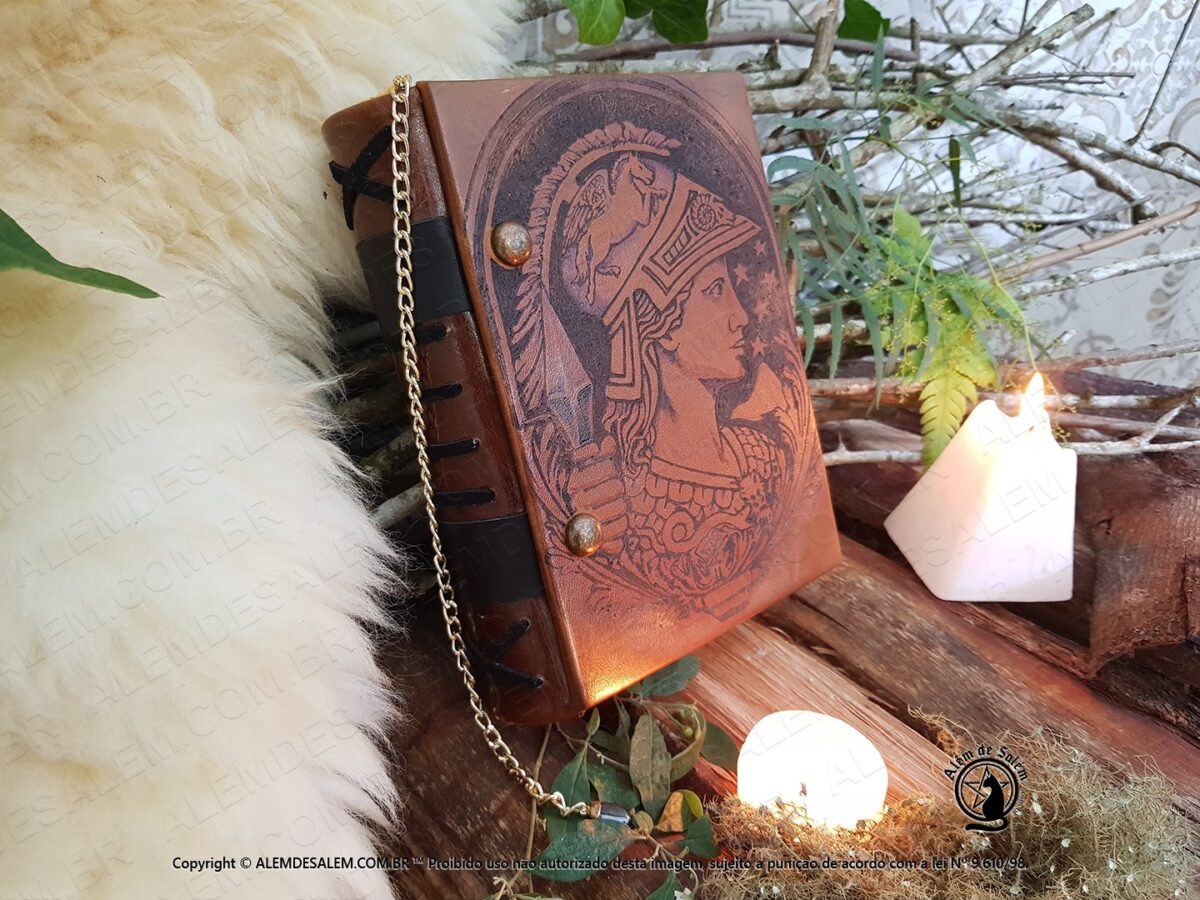 Livro das Sombras Grimório Greek Goddess, esse exemplar e exclusivo totalmente confeccionado conforme os costumes pagãos tradicionais. Em couro natural, sua costura em técnica medieval e riqueza nos detalhes, fazem deste exemplar uma peça única.