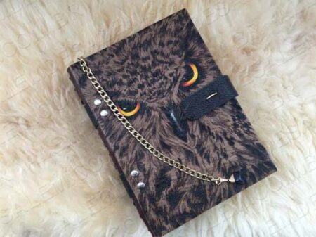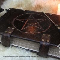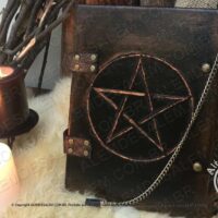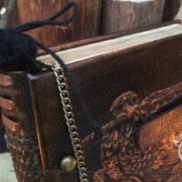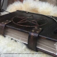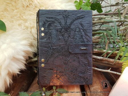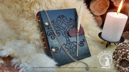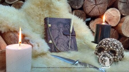 Livro com capa de madeira e forração dupla de couro legítimo, pirografado manualmente, com acabamento em pintura envelhecida na cor cobre. Uma obra de arte para aqueles que buscam eternizar suas memórias, práticas, e estudos da antiga arte.