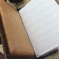- Capa e contra-capa de madeira, revestidas duplamente em couro legítimo, trabalhadas com gravação manual em pirografia.