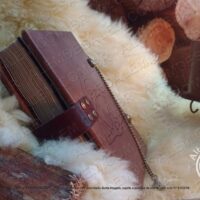 - Capa e contra-capa de madeira, revestidas em couro legítimo, trabalhadas com gravação manual em pirografia. Partes internas forradas em couro de cabra.