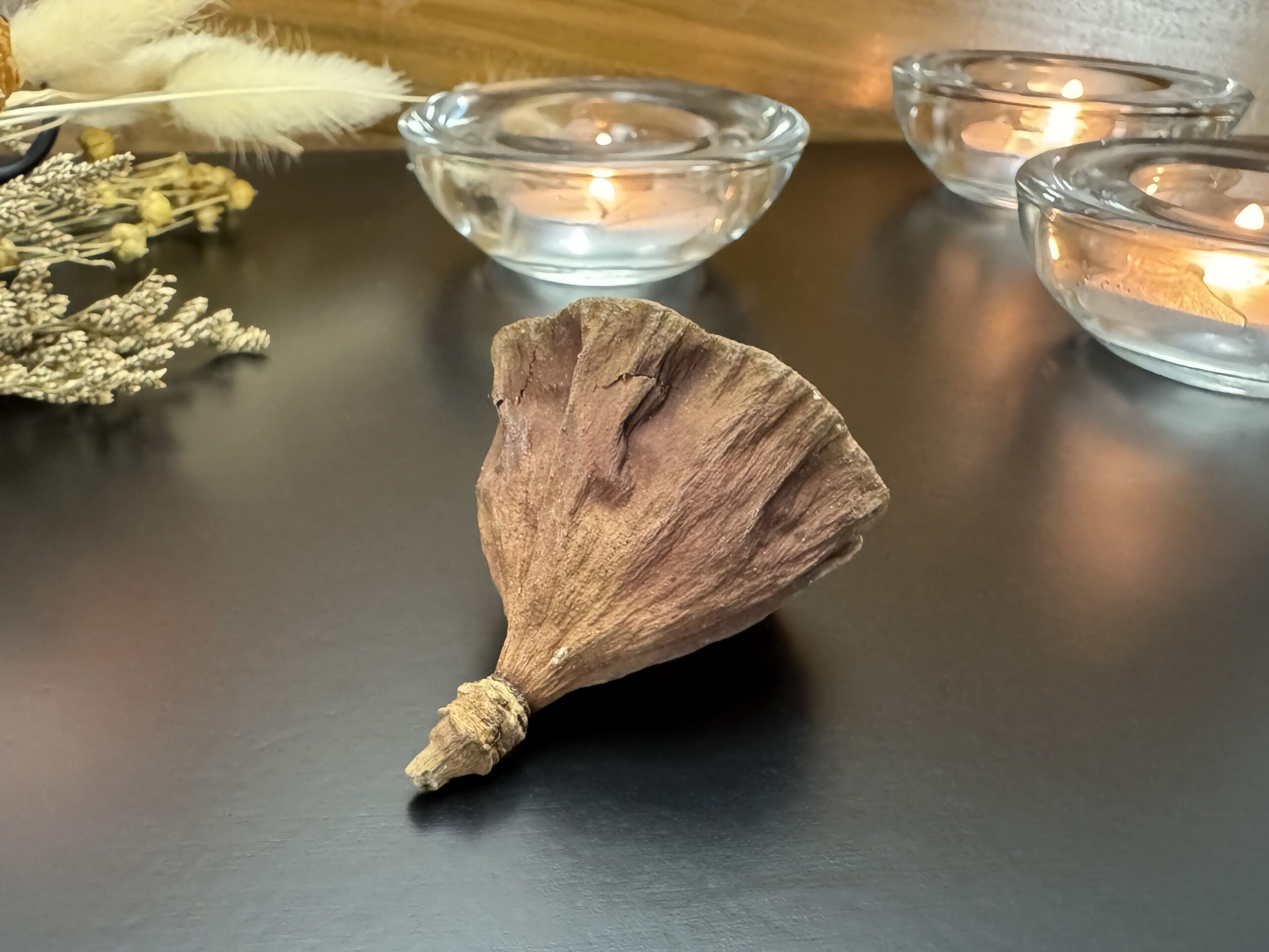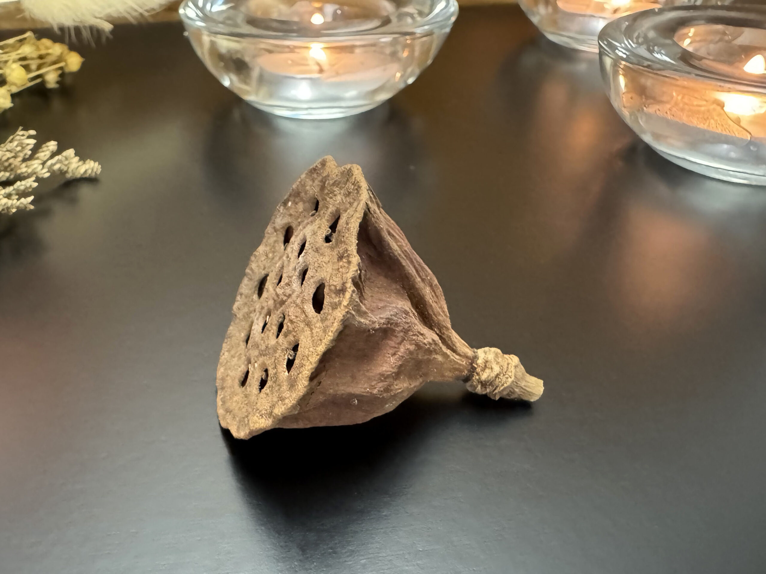 O lótus é reverenciado como flor divina em diversas tradições, especialmente no hinduísmo e no budismo, por representar elevação, consciência e pureza que nasce mesmo em águas profundas. A seedpod carrega essa assinatura de permanência e sustentação espiritual, funcionando como um amuleto natural ligado a conexão, prosperidade e enraizamento da intenção.