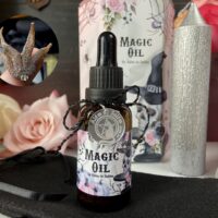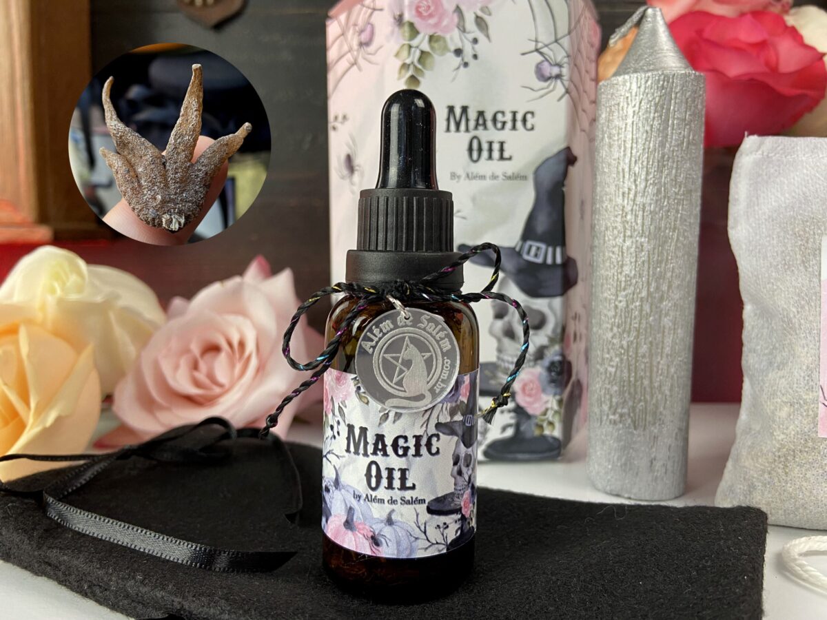 O pingente espelhado que adorna o óleo tem a função de proteção, trazendo nossa marca que também é um pentagrama.