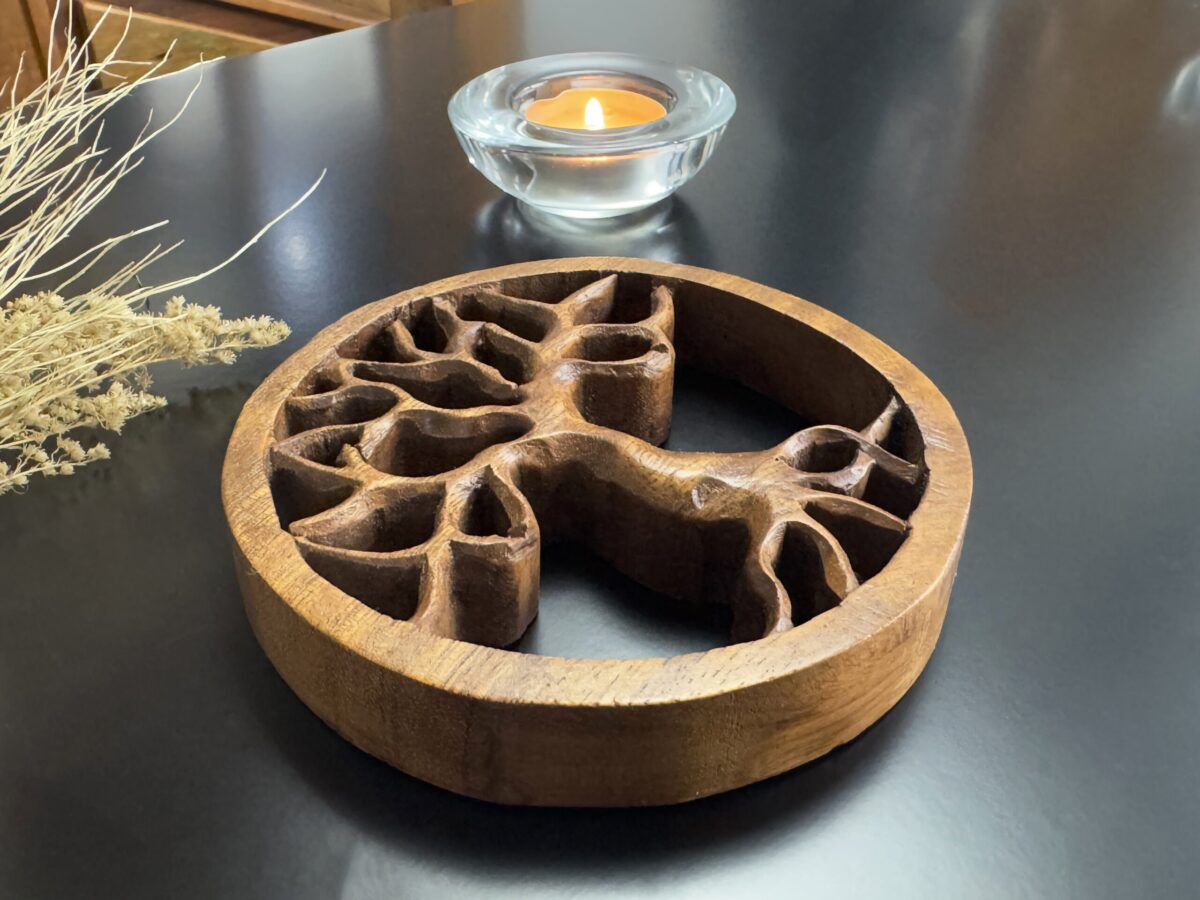 Lindíssima mandala artesanal representando a Árvore da Vida, esculpida à mão em madeira nobre com polimento em cera natural de abelha.