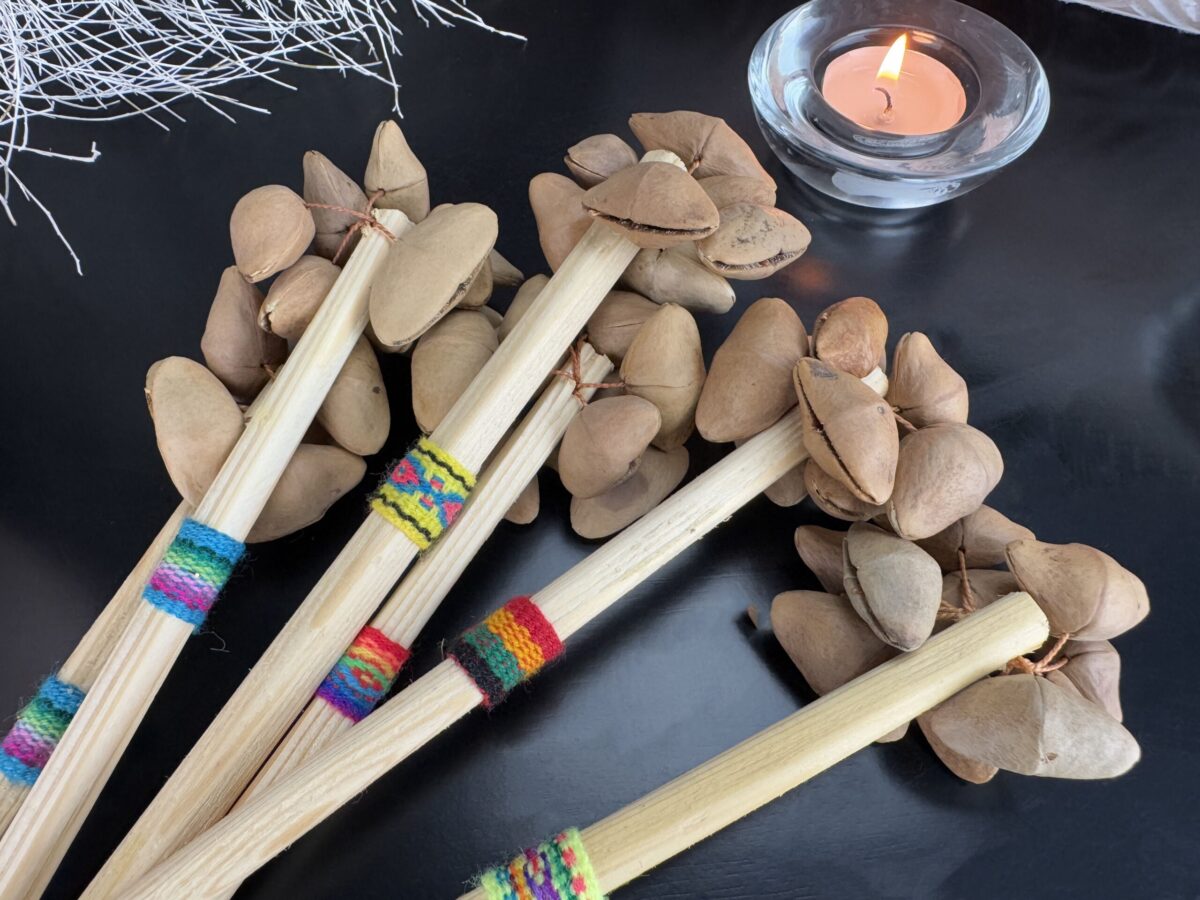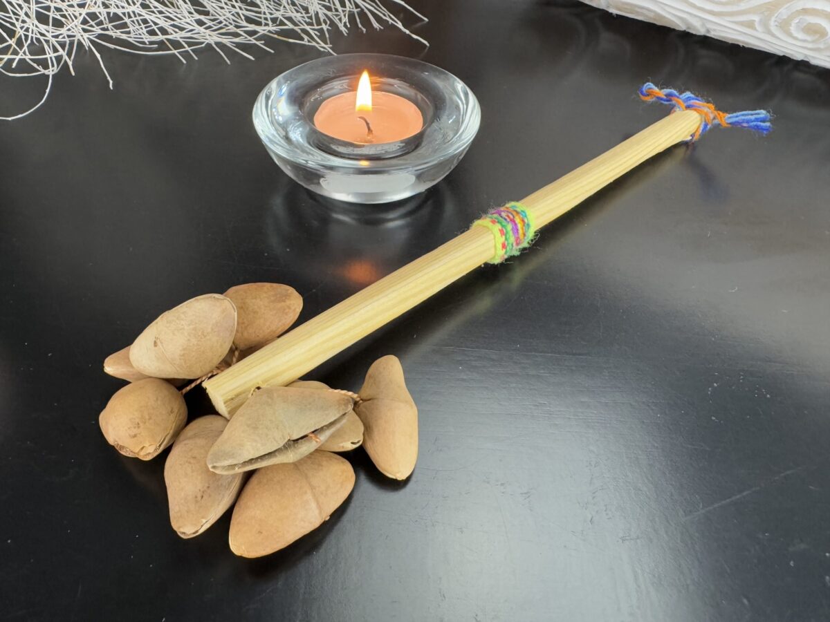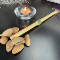 A maraca de semente de águaí, feita do fruto da árvore Pouteria caimito, é usada em rituais xamânicos para limpeza energética, harmonização e conexão espiritual. Seu som profundo promove introspecção e alinhamento com a energia da natureza, sendo um símbolo de equilíbrio e renovação. Feita de materiais orgânicos, carrega a essência da terra, tornando-se uma poderosa ferramenta espiritual.