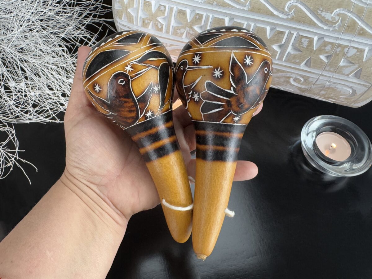 O chocalho peruano, ou maraca, é um instrumento tradicional usado em cerimônias espirituais e práticas xamânicas no Peru. Feito de materiais naturais, seu som sagrado promove purificação, proteção e alinhamento energético. Associado ao xamanismo andino, é usado para guiar jornadas espirituais, afastar energias negativas e celebrar a harmonia entre corpo, mente e espírito, sendo uma poderosa ferramenta de transformação e conexão com o sagrado.