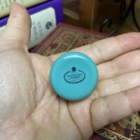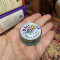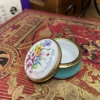 Pequeno objeto onde as pessoas armazenavam as pílulas que usariam no decorrer de uma viagem ou de uso diário. Em fina porcelana com policromia floral interna e marca impressa nos fundos, a peça possui ainda adorno de ouro 24k. Adaptado aos tempos atuais, pode ser utilizado nas mais diversas formas, incluindo armazenar preparados mágicos.