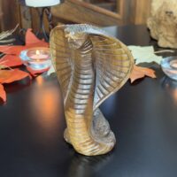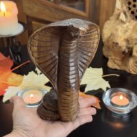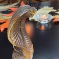 Uma peça artesanal lindíssima, esta escultura de uma cobra Naja foi habilmente entalhada manualmente em madeira por artesãos da Indonésia. Rica em detalhes e expressividade, a obra reflete a majestade e o poder simbólico deste animal sagrado.
