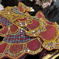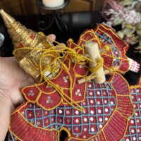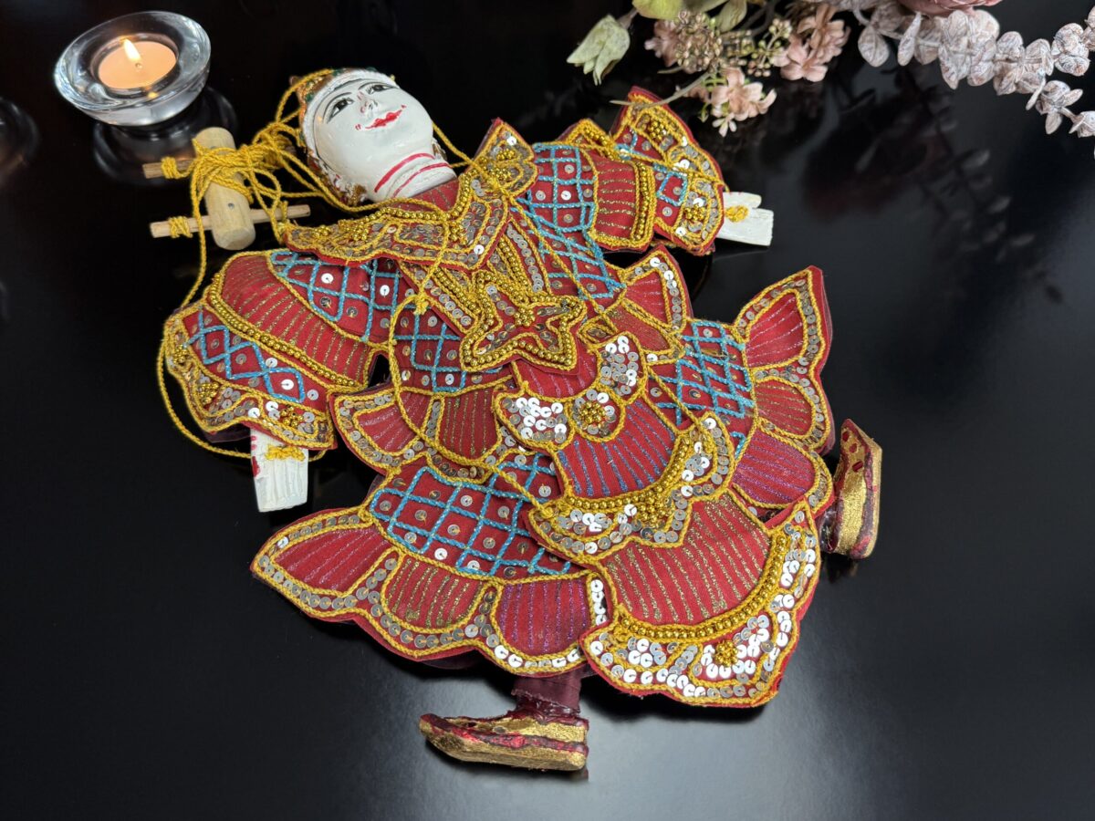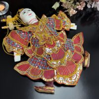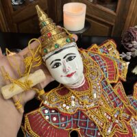 Esta belíssima marionete representa um Nat, divindade espiritual da tradição birmanesa, reverenciada como protetor dos lares, templos e caminhos espirituais. Os Nats fazem parte do antigo animismo do Sudeste Asiático, coexistindo com o budismo em Myanmar, e são cultuados por sua capacidade de intervir no mundo material, trazendo proteção, prosperidade e segurança espiritual.