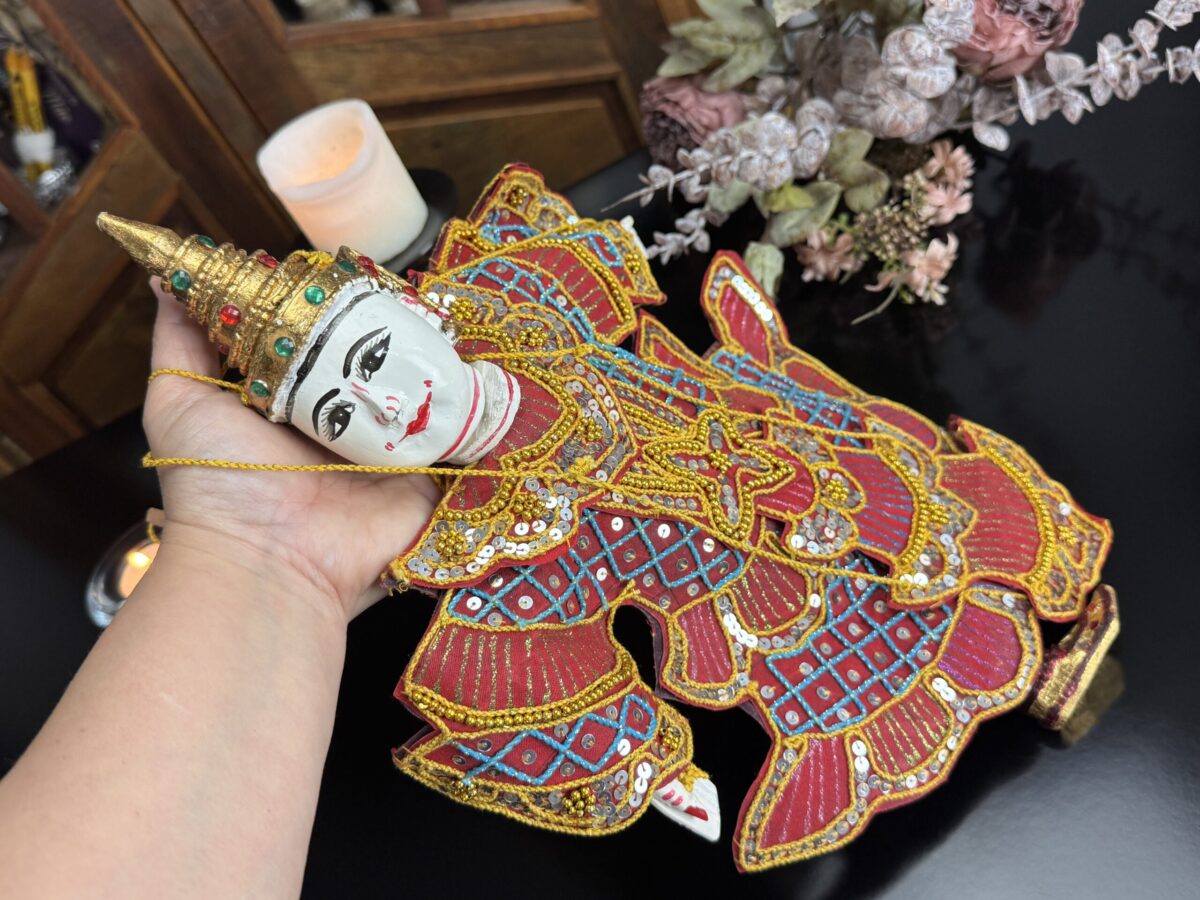A marionete representa um Nat masculino de alto posto espiritual, ricamente decorado, com expressões pintadas à mão e cordões originais de manipulação teatral; ideal para altares espirituais, práticas animistas, proteção de ambientes ou como item colecionável.