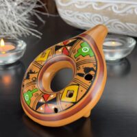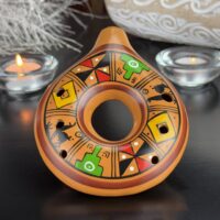 O formato dessa ocarina é bastante específico e incomum, possivelmente inspirado em um design circular ou em espiral que remete a conceitos cíclicos, como o tempo ou a eternidade, muito presentes nas culturas andinas e pré-colombianas. O formato de anel, aliado à pintura geométrica e simbólica, pode estar relacionado a representações estilizadas de calendários rituais ou cósmicos, comuns em várias civilizações indígenas da América Latina.