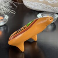 A ocarina é um instrumento andino tradicional, utilizado tanto para fins musicais quanto em rituais espirituais. Confeccionada em cerâmica, destaca-se por sua rica decoração, com símbolos culturais que incluem figuras antropomórficas e padrões geométricos ligados à mitologia andina. Este instrumento era usado para invocar a proteção divina, celebrar festivais e fortalecer a conexão com a natureza e a Pachamama. Além de sua função musical, também possuía valor como peça decorativa e símbolo de prestígio, refletindo a herança artística e espiritual das culturas peruanas antigas.