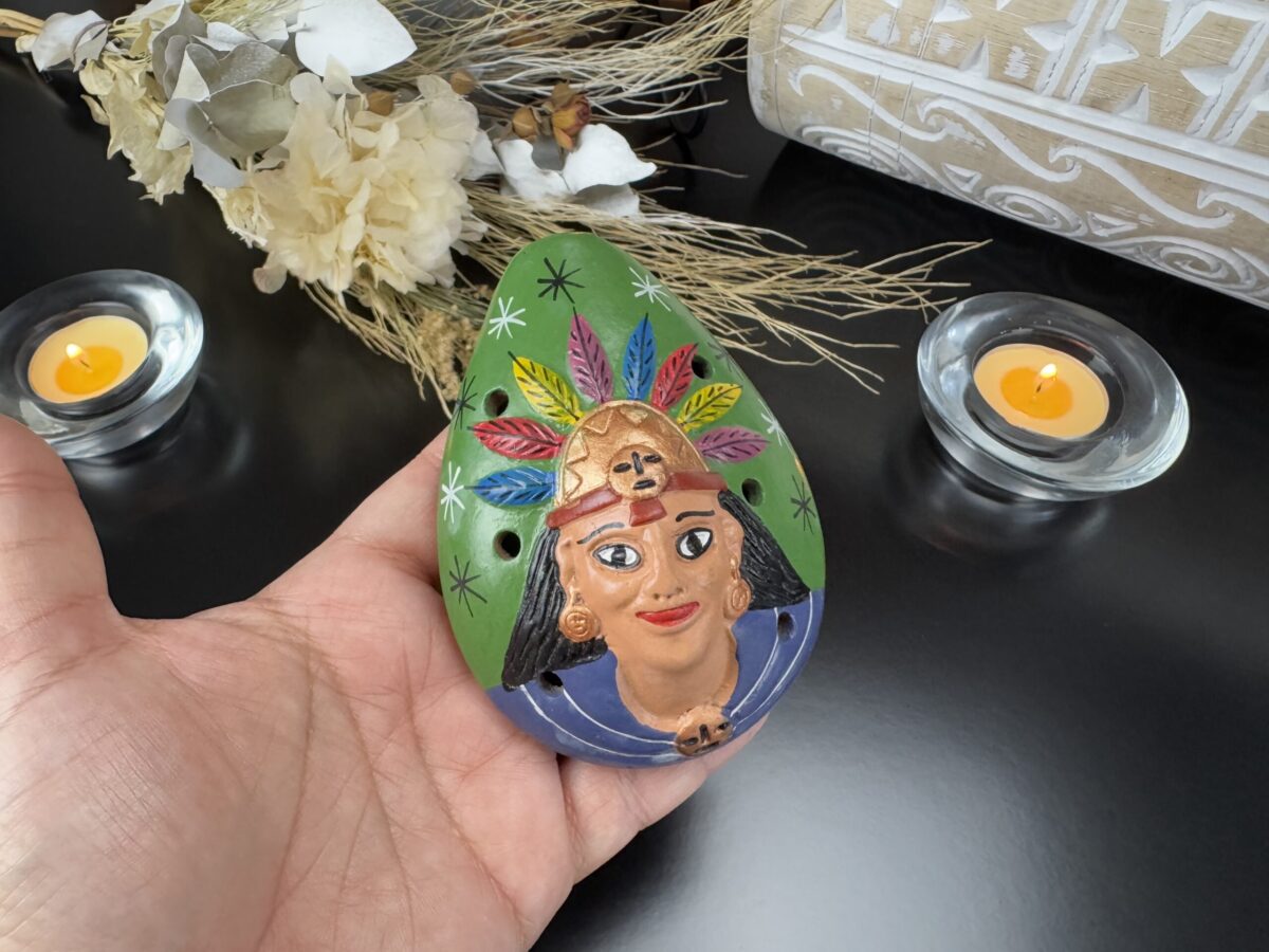 A ocarina é um instrumento andino tradicional, utilizado tanto para fins musicais quanto em rituais espirituais. Confeccionada em cerâmica, destaca-se por sua rica decoração, com símbolos culturais que incluem figuras antropomórficas e padrões geométricos ligados à mitologia andina. Este instrumento era usado para invocar a proteção divina, celebrar festivais e fortalecer a conexão com a natureza e a Pachamama. Além de sua função musical, também possuía valor como peça decorativa e símbolo de prestígio, refletindo a herança artística e espiritual das culturas peruanas antigas.