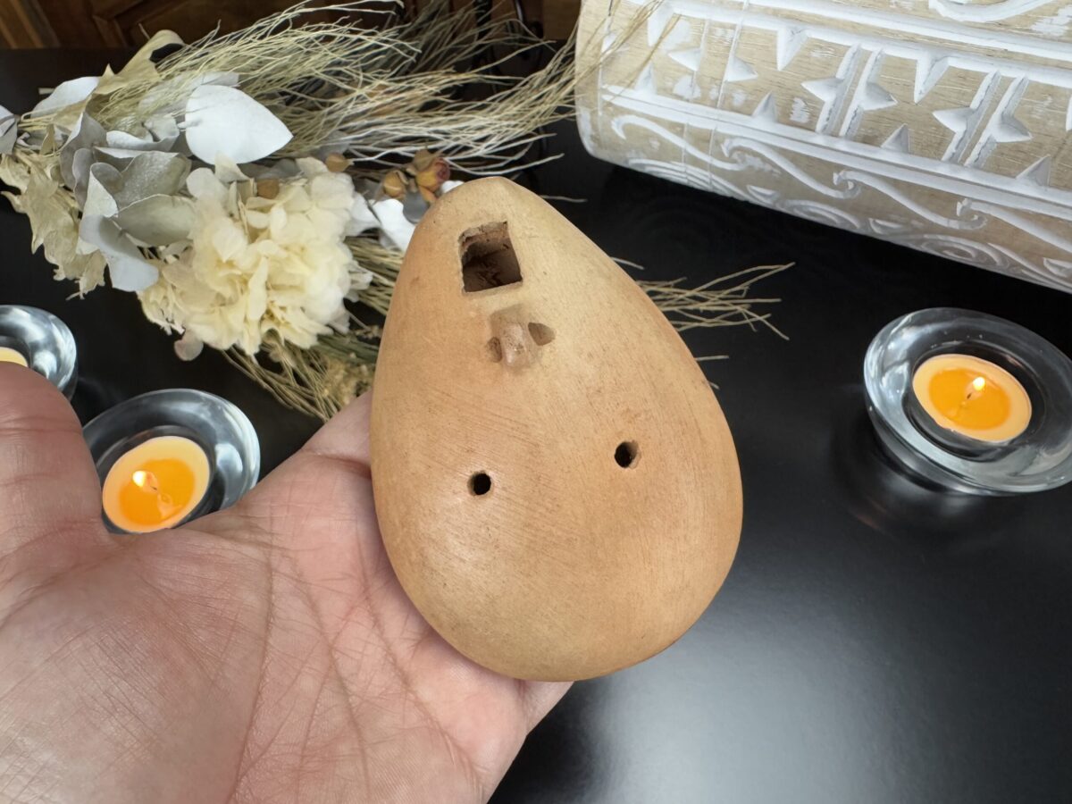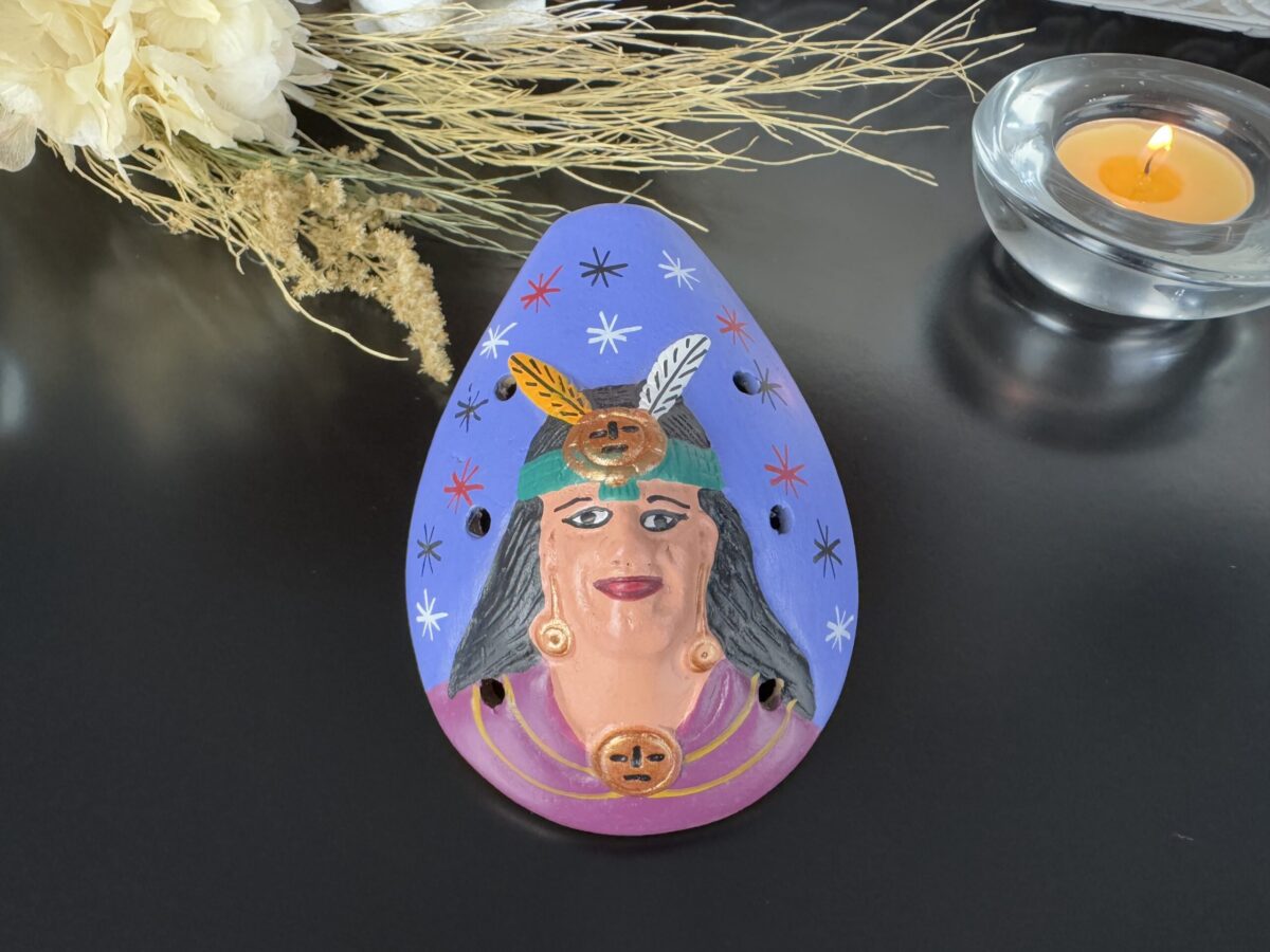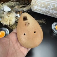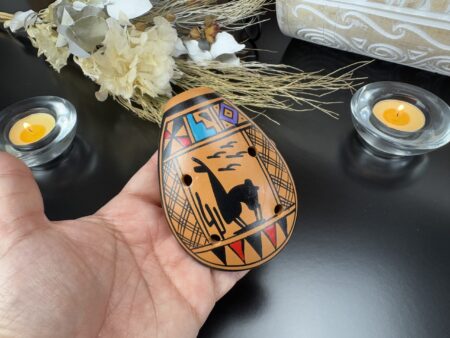 A ocarina é um instrumento andino tradicional, utilizado tanto para fins musicais quanto em rituais espirituais. Confeccionada em cerâmica, destaca-se por sua rica decoração, com símbolos culturais que incluem figuras antropomórficas e padrões geométricos ligados à mitologia andina. Este instrumento era usado para invocar a proteção divina, celebrar festivais e fortalecer a conexão com a natureza e a Pachamama. Além de sua função musical, também possuía valor como peça decorativa e símbolo de prestígio, refletindo a herança artística e espiritual das culturas peruanas antigas.