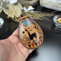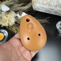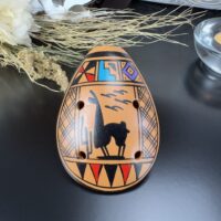 A ocarina é um instrumento andino tradicional, utilizado tanto para fins musicais quanto em rituais espirituais. Confeccionada em cerâmica, destaca-se por sua rica decoração, com símbolos culturais que incluem figuras antropomórficas e padrões geométricos ligados à mitologia andina. Este instrumento era usado para invocar a proteção divina, celebrar festivais e fortalecer a conexão com a natureza e a Pachamama. Além de sua função musical, também possuía valor como peça decorativa e símbolo de prestígio, refletindo a herança artística e espiritual das culturas peruanas antigas.