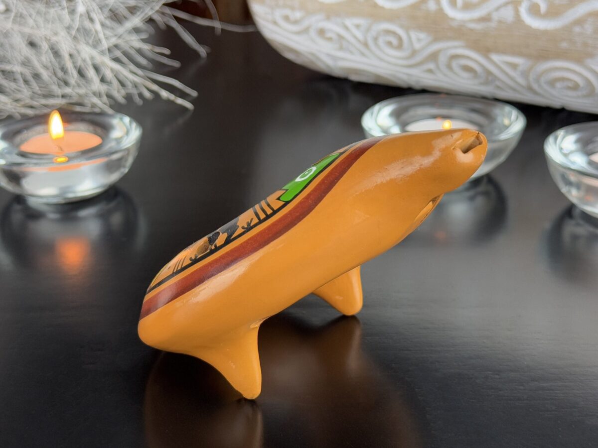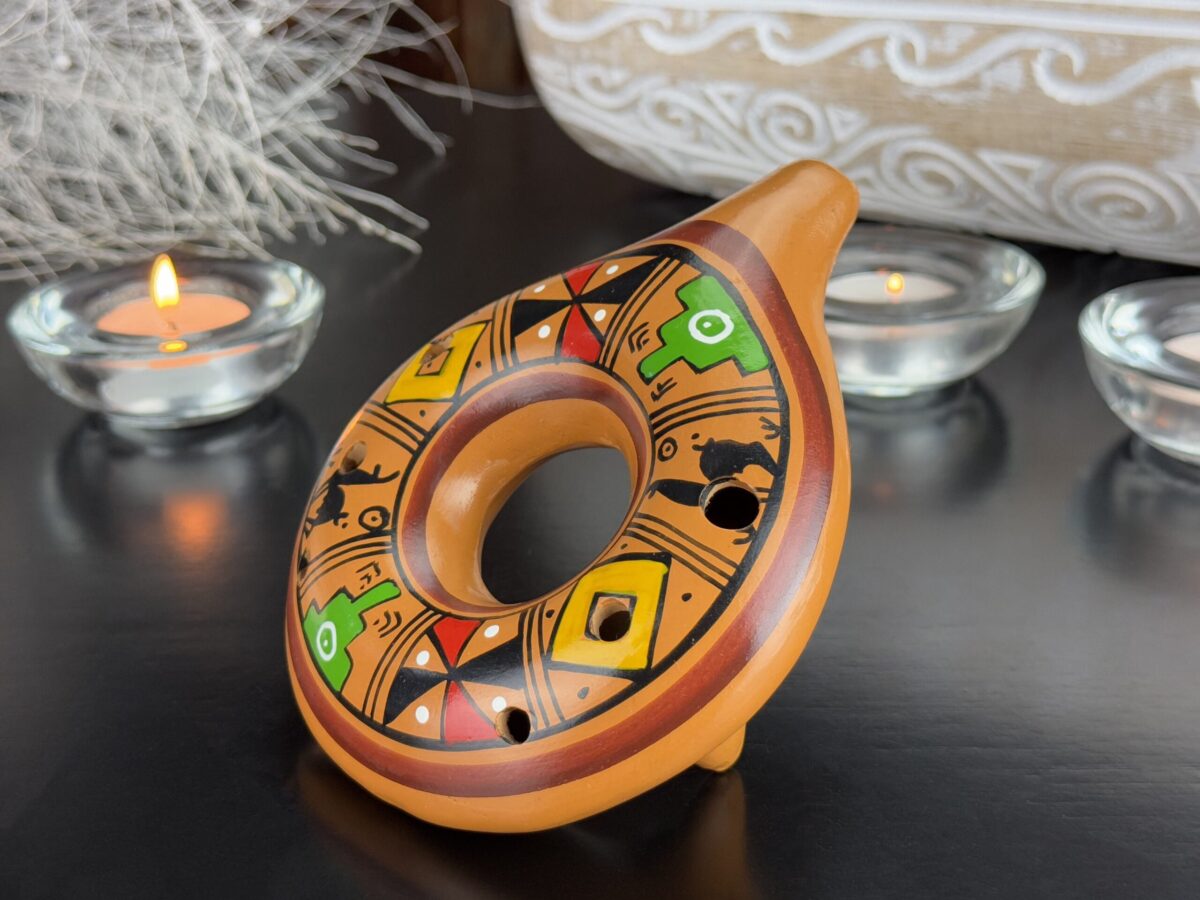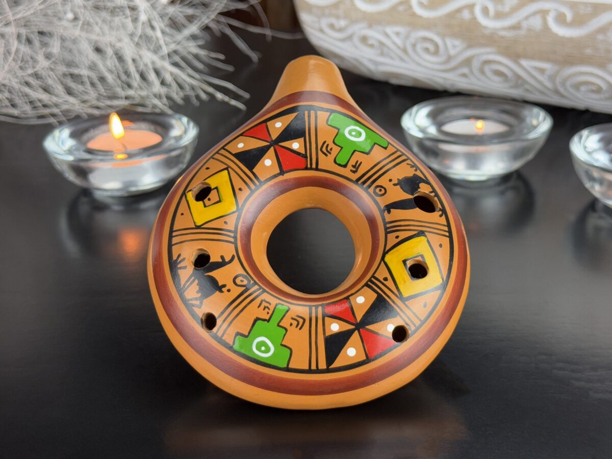 A ocarina é um instrumento andino tradicional, utilizado tanto para fins musicais quanto em rituais espirituais. Confeccionada em cerâmica, destaca-se por sua rica decoração, com símbolos culturais que incluem figuras antropomórficas e padrões geométricos ligados à mitologia andina. Este instrumento era usado para invocar a proteção divina, celebrar festivais e fortalecer a conexão com a natureza e a Pachamama. Além de sua função musical, também possuía valor como peça decorativa e símbolo de prestígio, refletindo a herança artística e espiritual das culturas peruanas antigas.