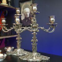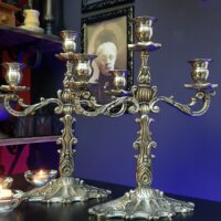 Verdadeira relíquia em perfeito estado de conservação, este lindíssimo par de Castiçais triplos, espessurados à prata são itens incríveis para um altar de Magia.