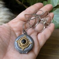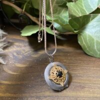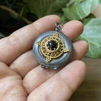 Lindíssimo Pedantife Antigo, década de 40 feito em Estanho, com detalhes em dourado, pedra no centro (possivelmente ônix) e corrente de prata de lei.