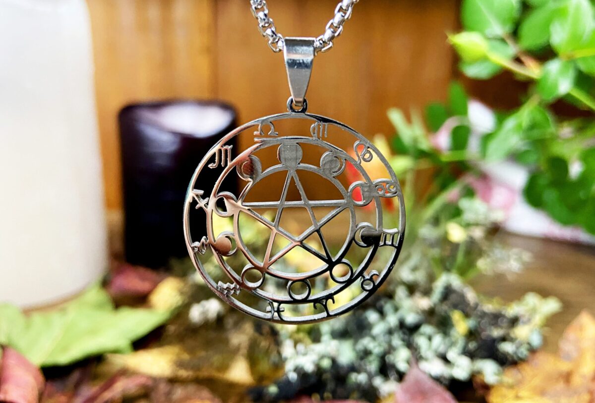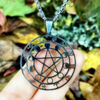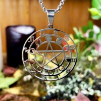 Belíssimo pingente com corrente em aço inoxidável com pentagrama centralizado, circulado por signos do zodíaco e ciclos lunares.