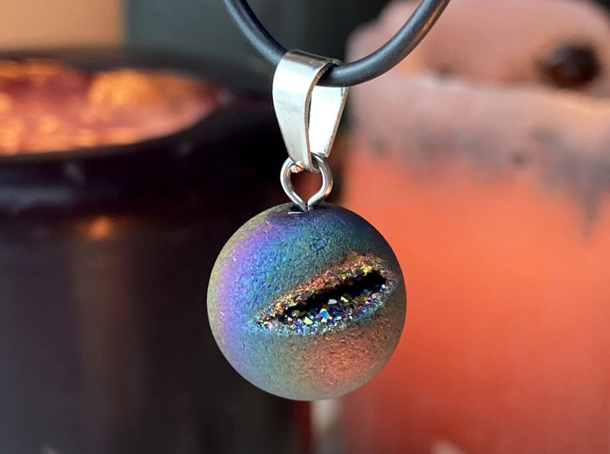 Geodo Marroquino com nuances cintilantes – Pingente Geodo Rainbow Aura – Geod Rainbow – Geodo Titanium