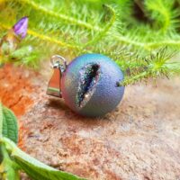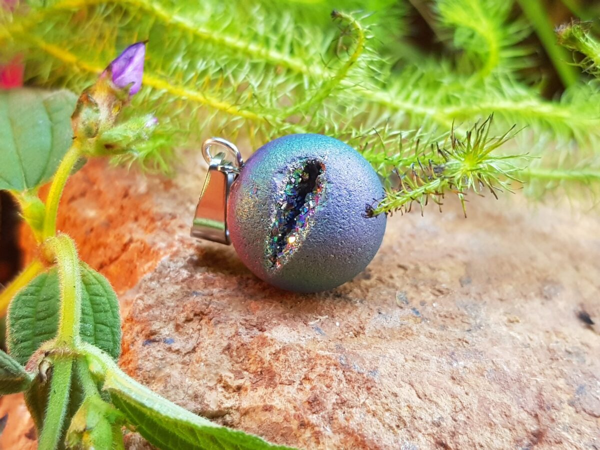 Geodo Marroquino com nuances cintilantes – Pingente Geodo Rainbow Aura – Geod Rainbow – Geodo Titanium
