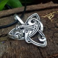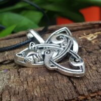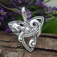 Lindo pingente de aço inoxidável de excelente qualidade, com Triquetra Celta e gatinho repousando no símbolo. Um mimo para praticantes apaixonados por felinos e pela Magia da Irlanda Celta.