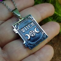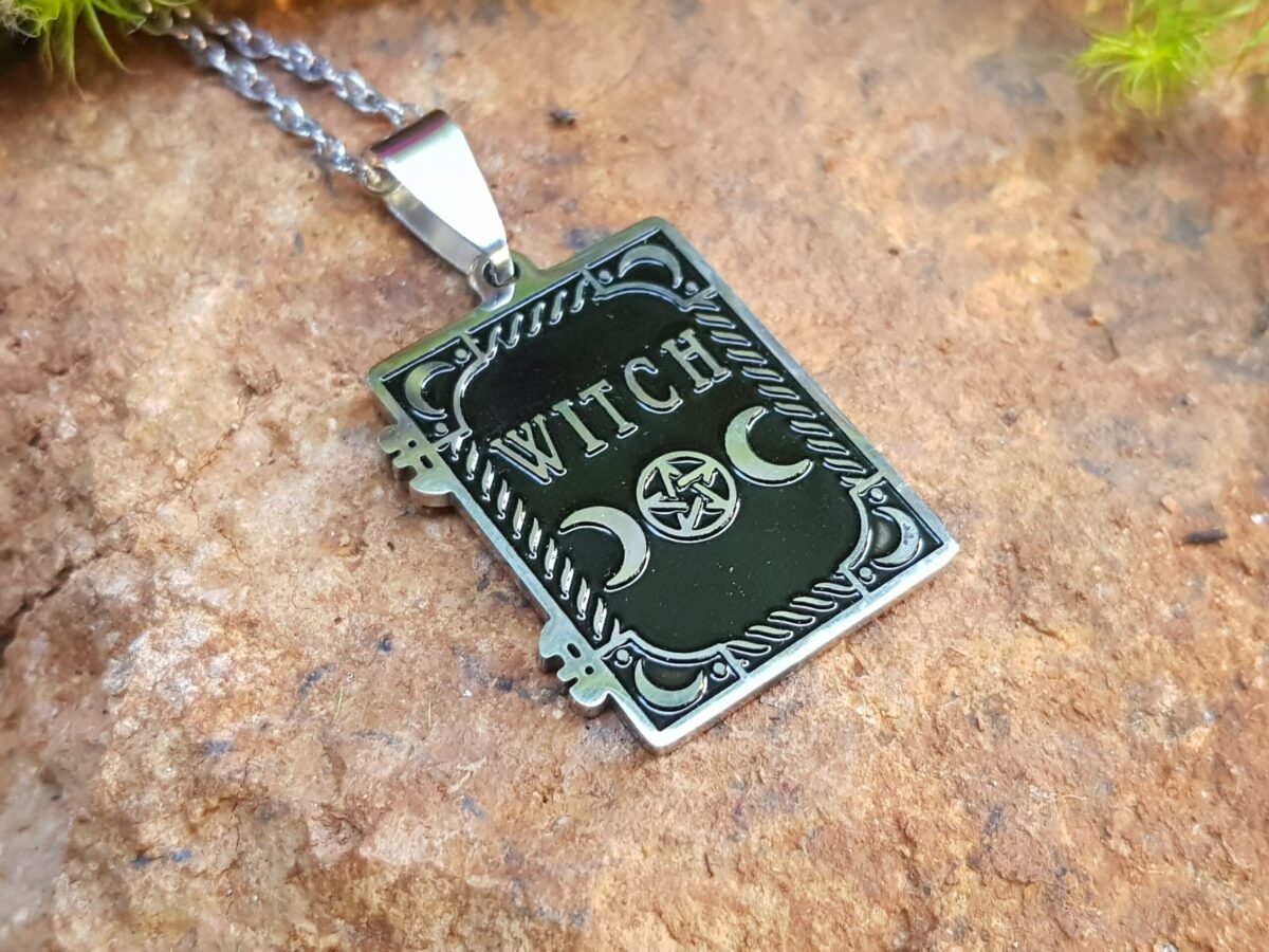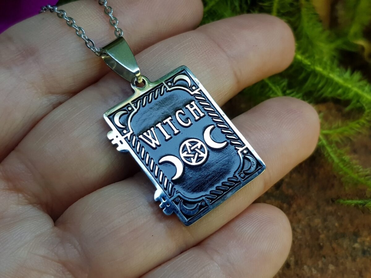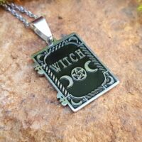 Pingente em Inox representando um Grimório com a escrita ‘With’ seguido pelo símbolo ‘Triluna’ com Pentagrama.