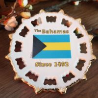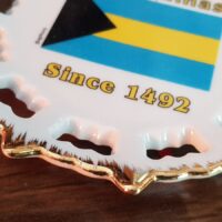 Belíssimo e impecável prato decorativo de porcelana das Bahamas com adorno de ouro.