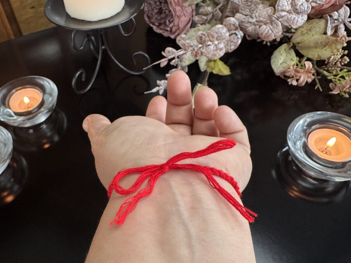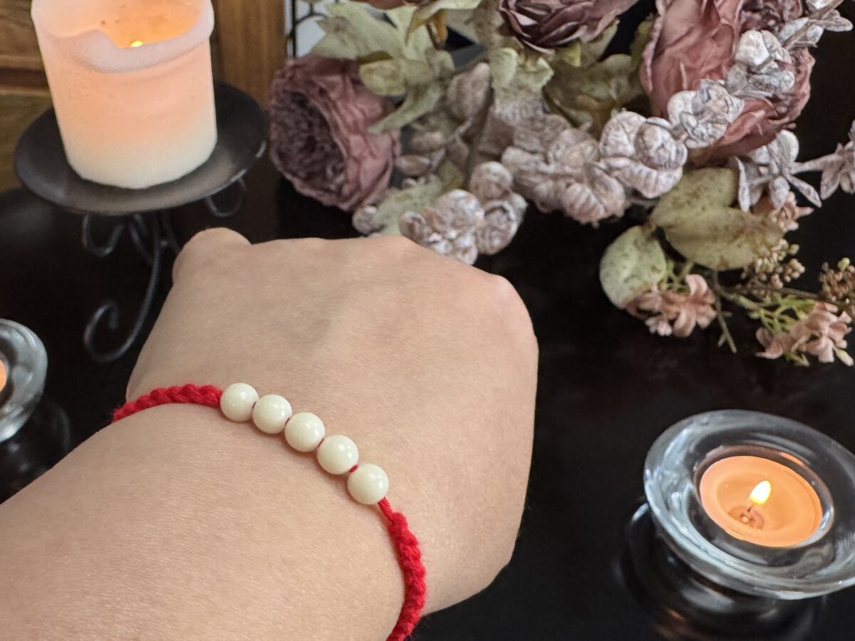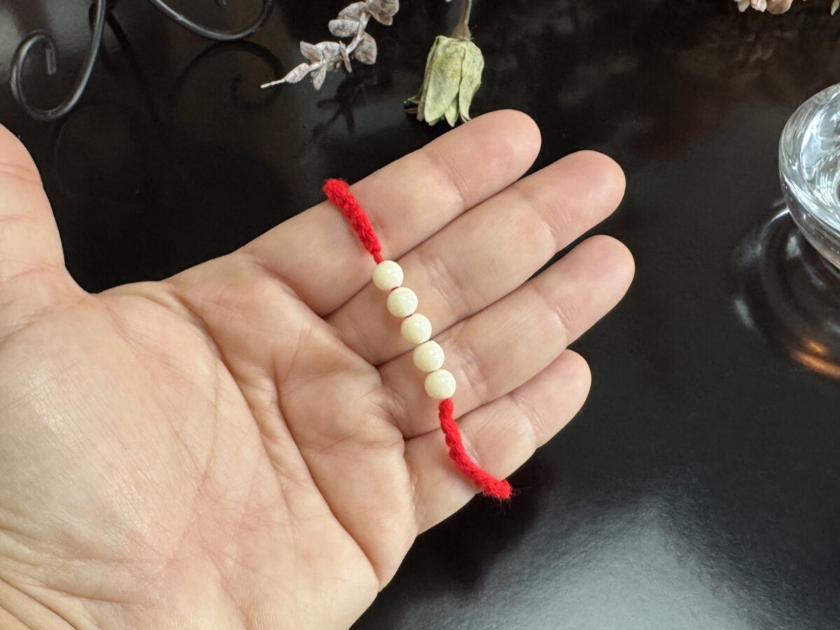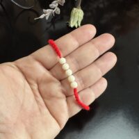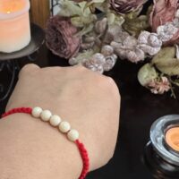 Com cordão vermelho tradicional e contas claras, ela simboliza pureza, clareza mental e afastamento de negatividades. Segundo a tradição tailandesa, esse tipo de pulseira deve ser usada no pulso esquerdo para absorver boas energias e manter a aura protegida.