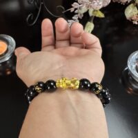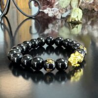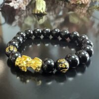 Pulseira feita com contas de vidro preto brilhante, com detalhes gravados e pintados em dourado com criatura mitológica (Pixiu) chinesa conhecida como guardião da riqueza, protetor espiritual e símbolo de boa fortuna.