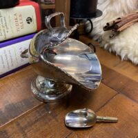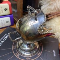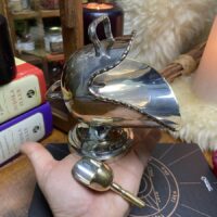 Diferente recipiente da década de 50 espessurado à prata 90 com bordas contrastadas e ramagens lavradas. A peça era utilizada antigamente como uma espécie de molheira de mesa, mas serve perfeitamente como porta ervas, grãos, pétalas e outros ingredientes que venham a ser utilizados no altar. O recipiente acompanha uma pequena concha também em prata.