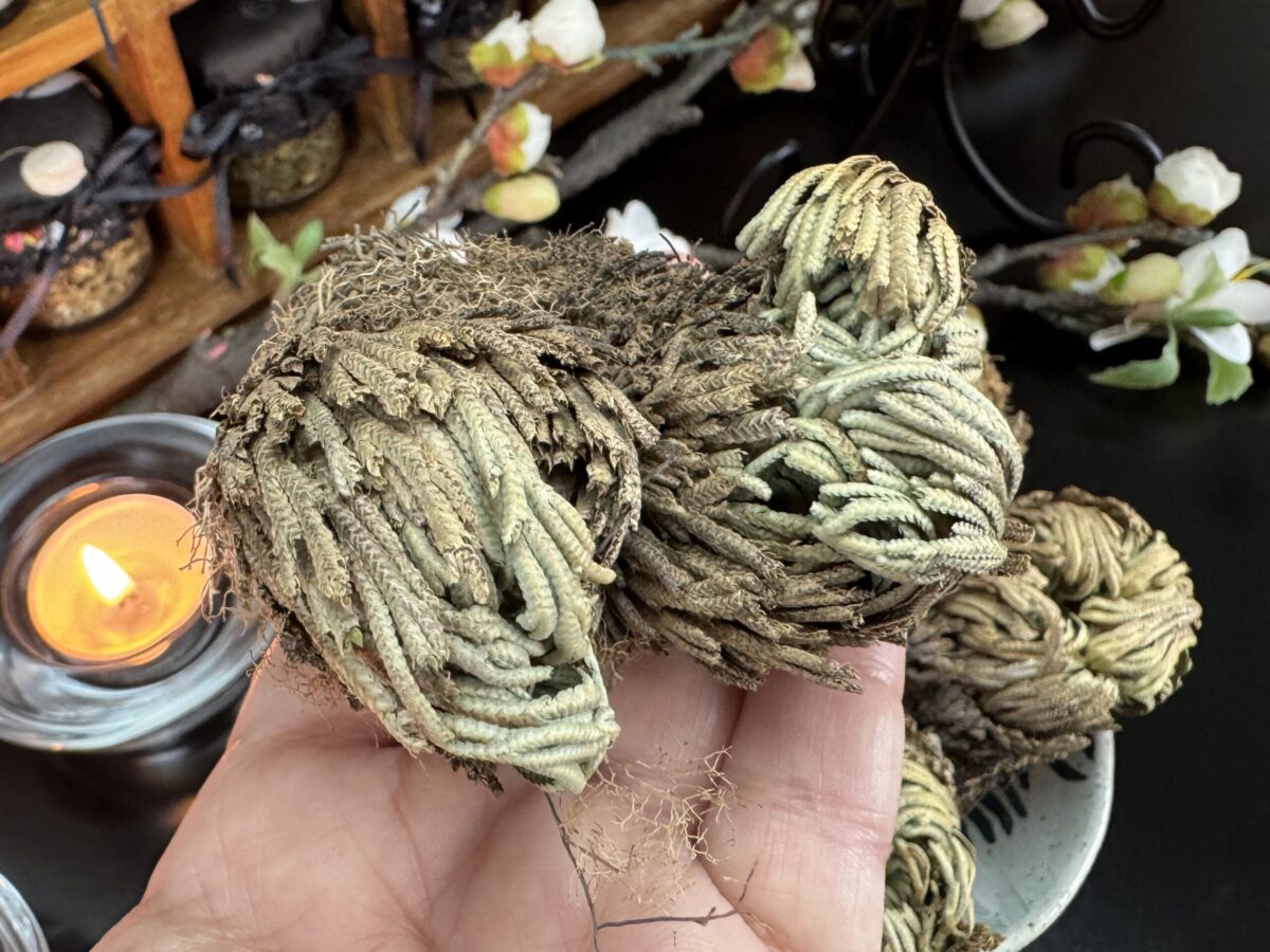 - Uso em Feitiços e Rituais: Presente em práticas mágicas como Mojos e Spirit Dolls, a Rosa de Jericó é usada como fluído espiritual para abençoar pessoas, consagrar objetos e trazer efeitos rápidos e precisos.