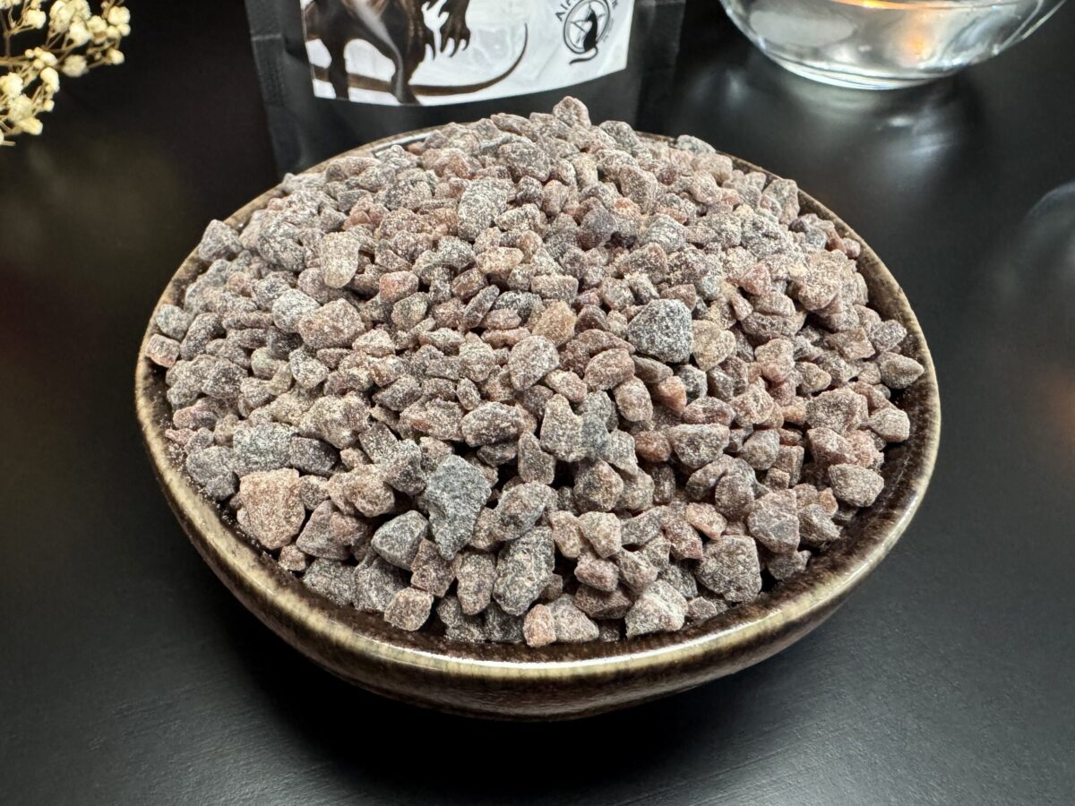 Diferente de outros sais, o Kala Namak passa por um processo alquímico em que é aquecido junto a carvão vegetal, sementes e cascas de árvores sagradas, absorvendo suas propriedades purificadoras e tornando-se um elemento poderoso para feitiços e rituais mágicos.