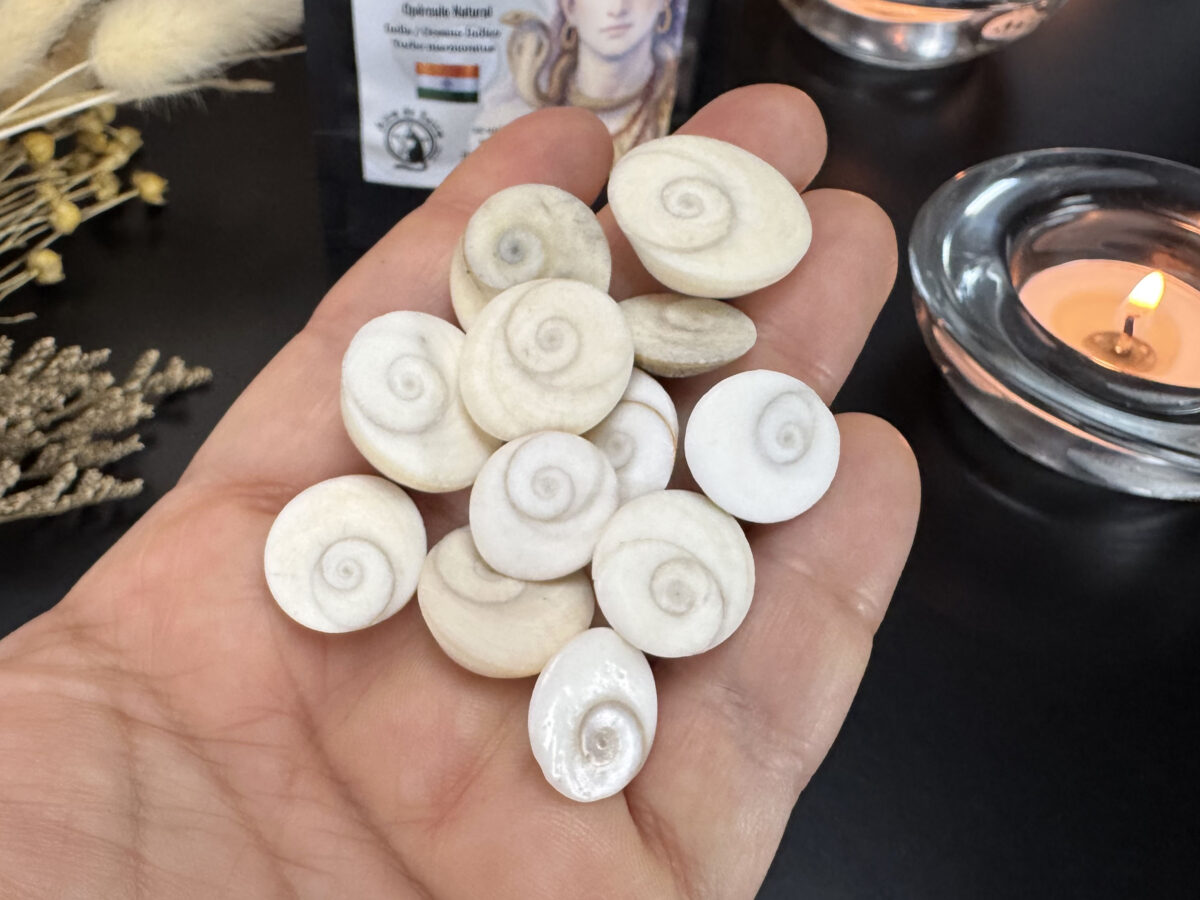 O Shiva Eye, também chamado Cat’s Eye Shell, é o operculum natural de um caracol marinho do Indo Pacífico, reconhecido pelo desenho em espiral que lembra um olho. Na tradição espiritual indiana, ele é associado ao Olho de Shiva, símbolo de visão interior, proteção e despertar da consciência. É uma peça pequena, mas com presença forte: observa, sela, protege e sustenta práticas de intuição.