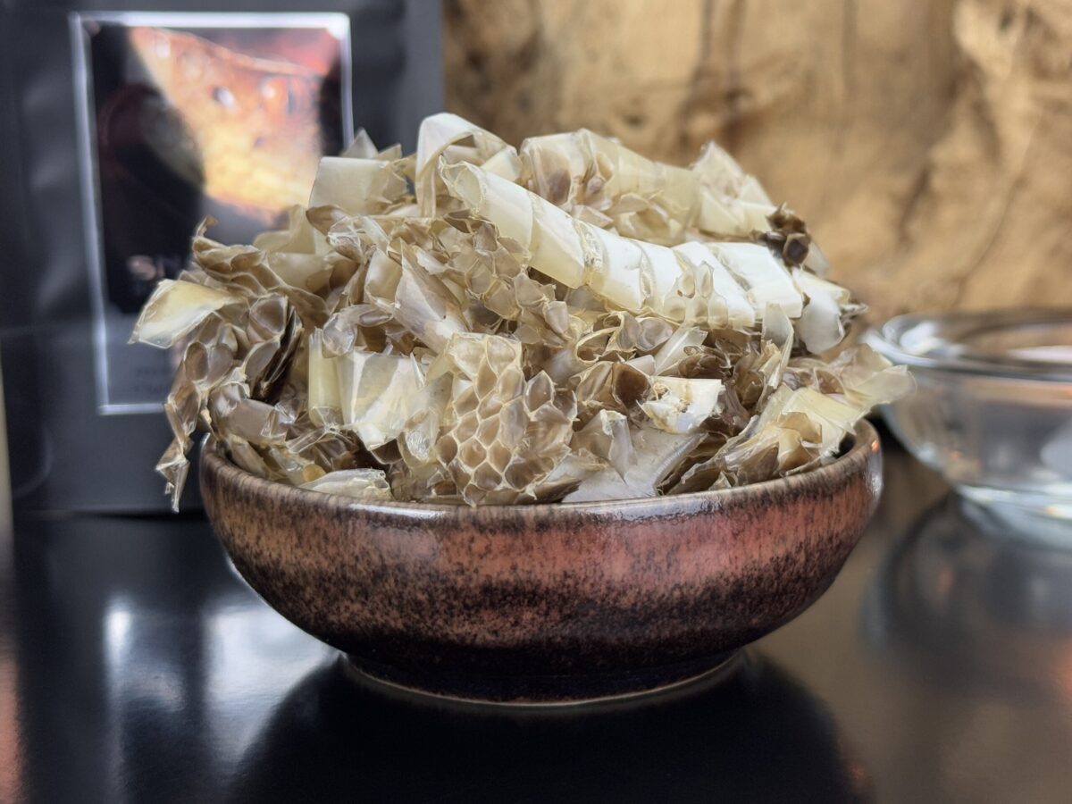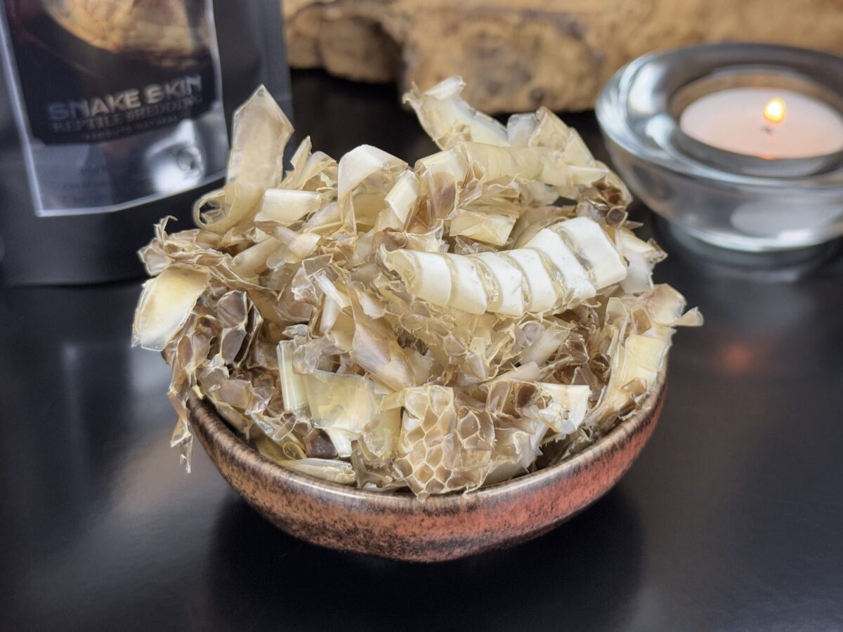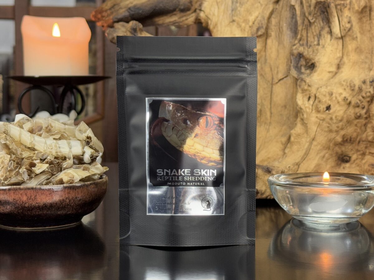 O produto é referente à ecdise (muda) natural da serpente, coletada na natureza. No geral, uma cobra jovem troca de pele a cada quatro semanas, já uma adulta troca de cinco a oito vezes por ano. A pele das cobras é coberta por escamas que são compostas de queratina, e elas realizam essa troca para poder expandir seu corpo.