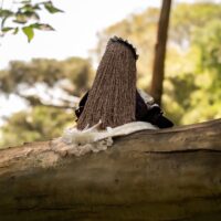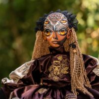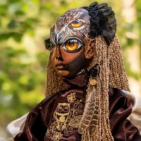 Além disso, seu visual inclui uma calça de cetim e uma anágua de tricoline, adicionando camadas de textura e elegância à sua aparência. Seus cabelos de lã são adornados com rosas negras, organza e penas de coruja, criando um visual único.