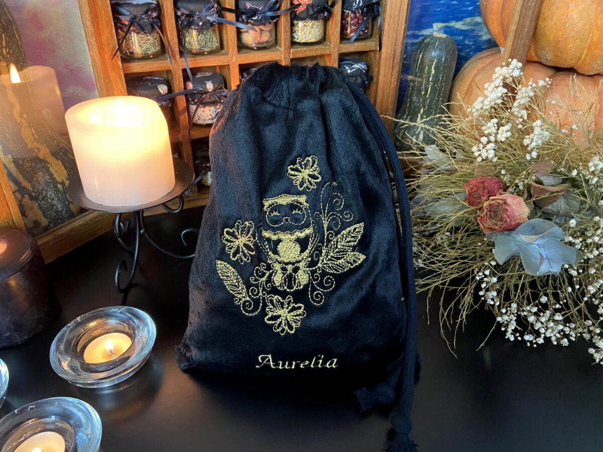 - 1 Bag bordada com materiais para o ritual de ativação e comando (velas de sebo de carneiro, resinas raras, ervas entre outros).