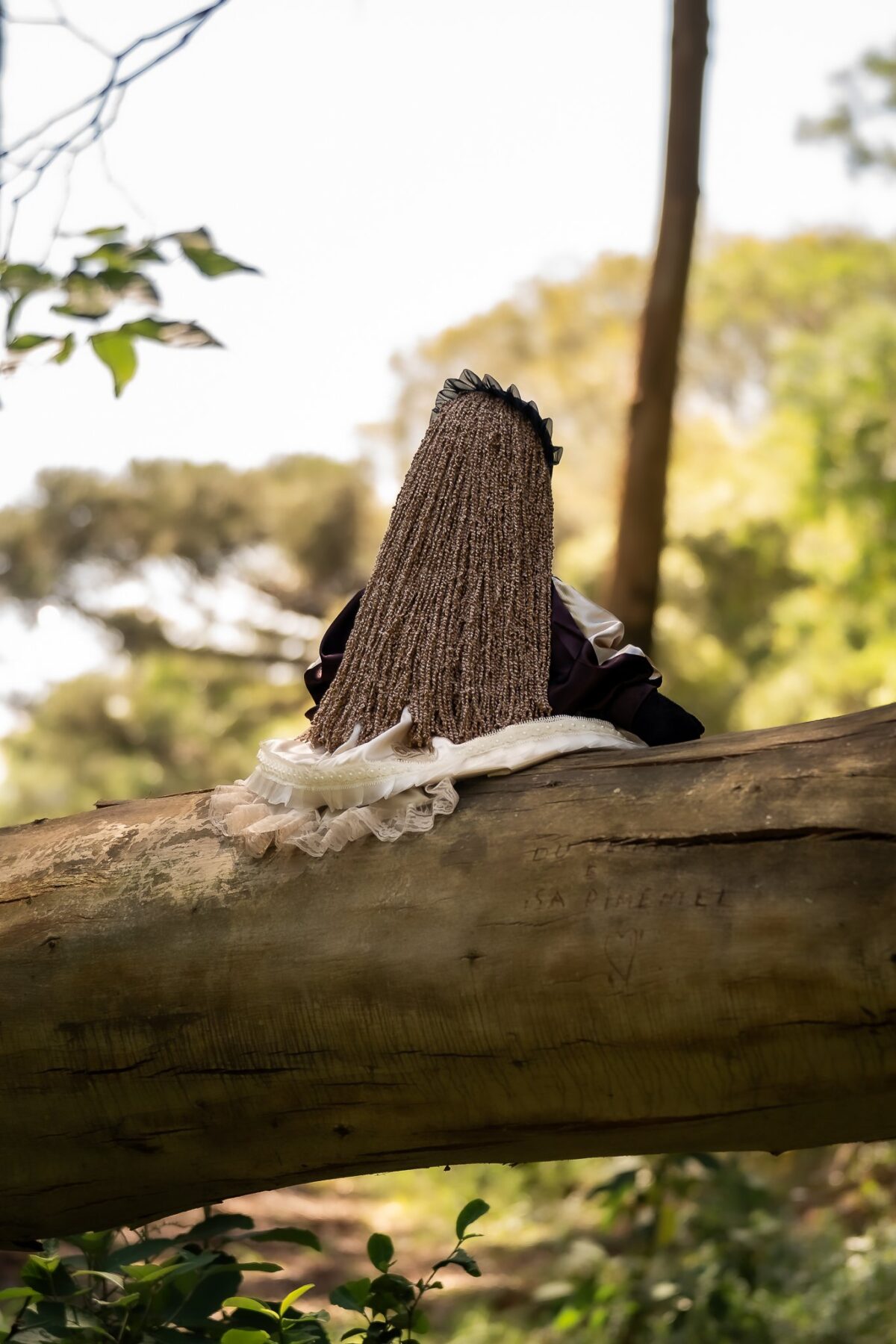 Além disso, seu visual inclui uma calça de cetim e uma anágua de tricoline, adicionando camadas de textura e elegância à sua aparência. Seus cabelos de lã são adornados com rosas negras, organza e penas de coruja, criando um visual único.