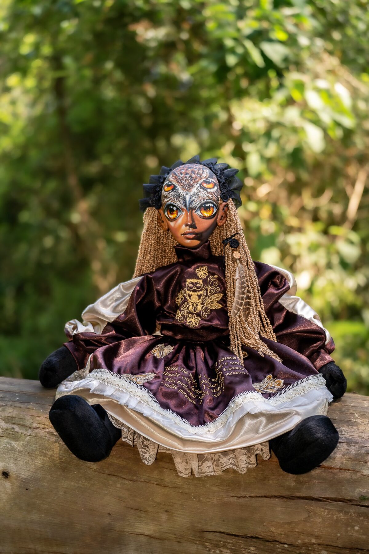- Spirit Doll Mística Aurelia ritualizada com trabalho interno (incluindo sigilo de couro pirografado)