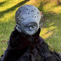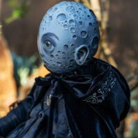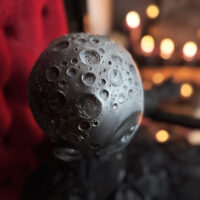 Cabeça esculturada com topografia lunar em relevo, crateras de diferentes diâmetros e bordas suaves. A pintura é monocromática em gradações de cinza, com veladuras nacaradas e toques prateados que acentuam o relevo. Olhos grandes em tons de grafite e pérola dão o brilho frio de plenilúnio. Nas orelhas, um par de safiras lapidadas confere ponto de luz firme.