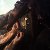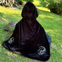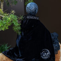 O traje é composto por vestido em renda preta de desenho floral. Por baixo, anágua mantém a arquitetura da saia e cria caimento pleno. Sobre o conjunto, capa de veludo preto com capuz, bordada nas bordas com motivo lunar e fechamento por laço de veludo ao centro. O conjunto acompanha pequena bolsa de veludo com bordado de fases lunares, destinada a resguardar elementos próprios de sua prática.