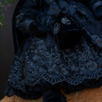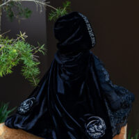 Materiais e acabamentos privilegiam textura e contraste: veludo denso, renda em alto relevo, brilho metálico discreto nos detalhes prateados. A peça apresenta presença serena e precisa, alinhada à natureza lunar de Selenyth.