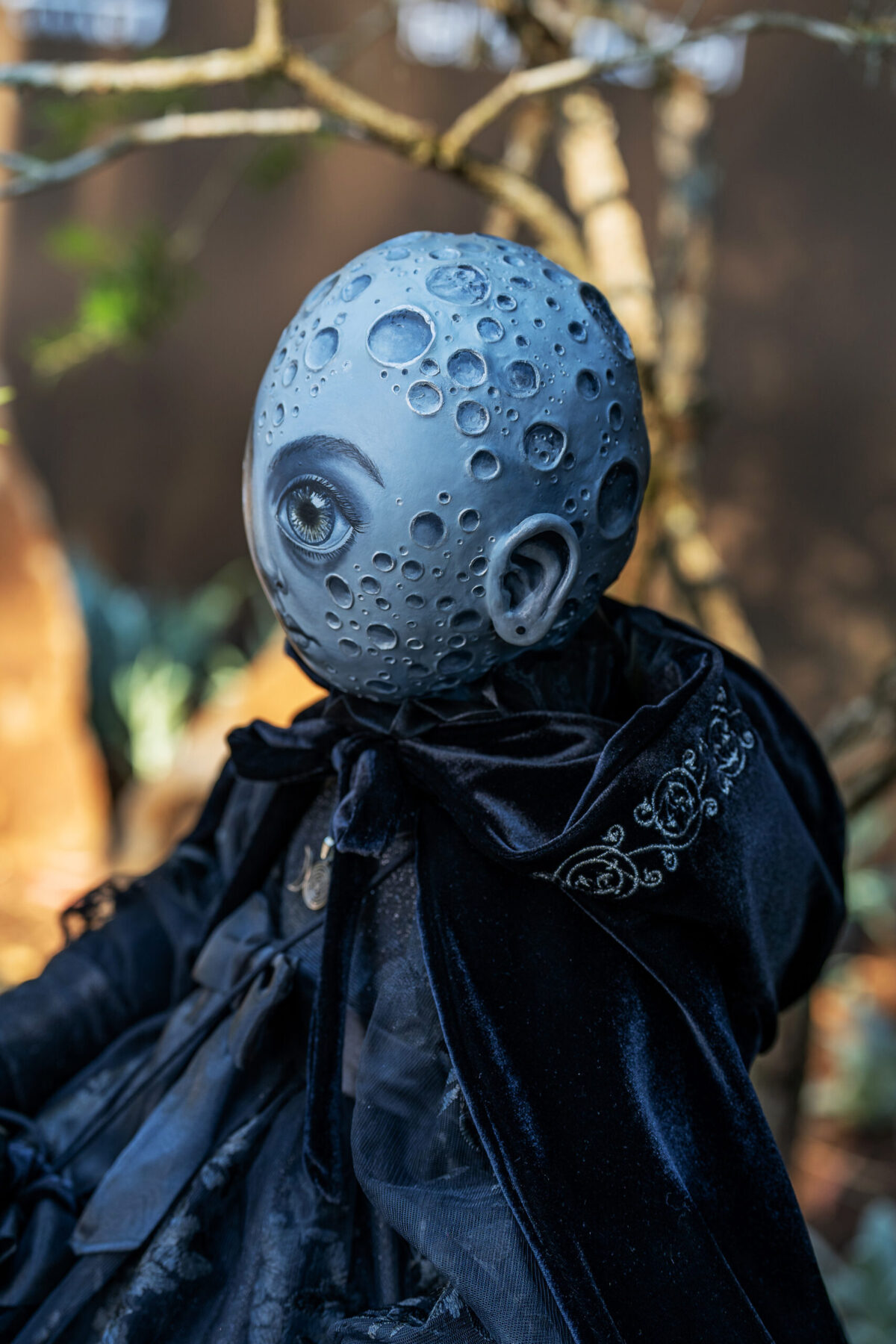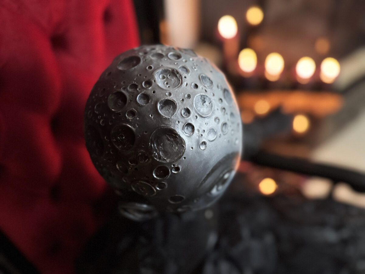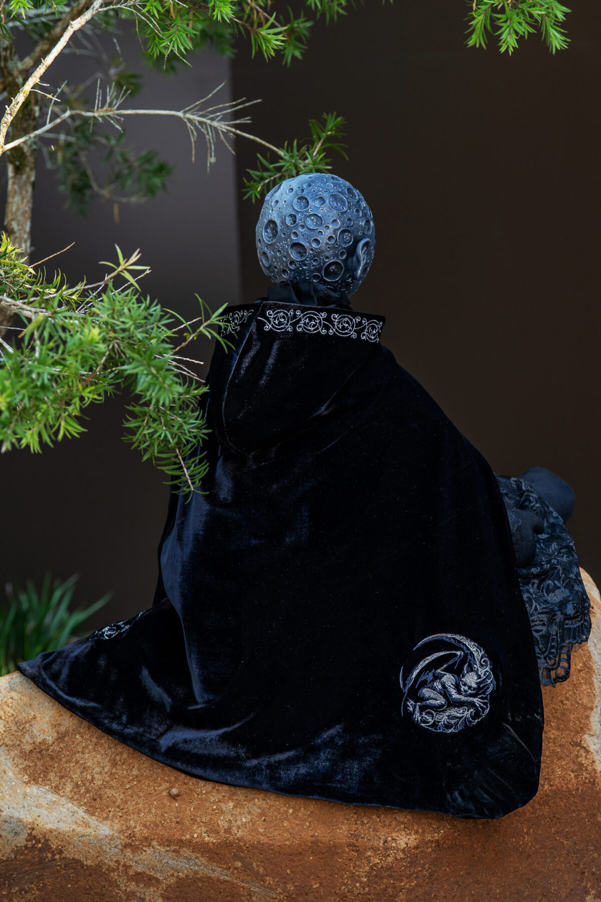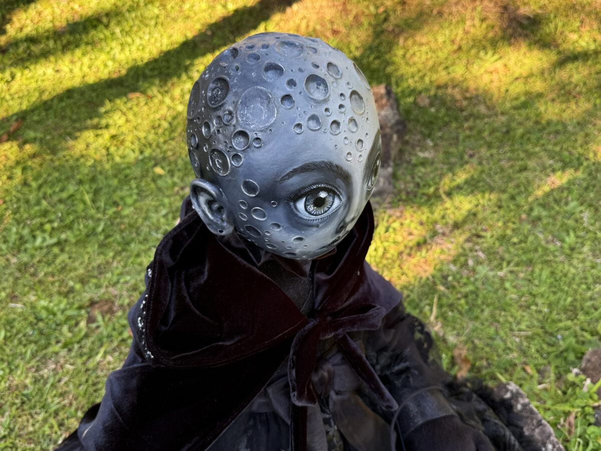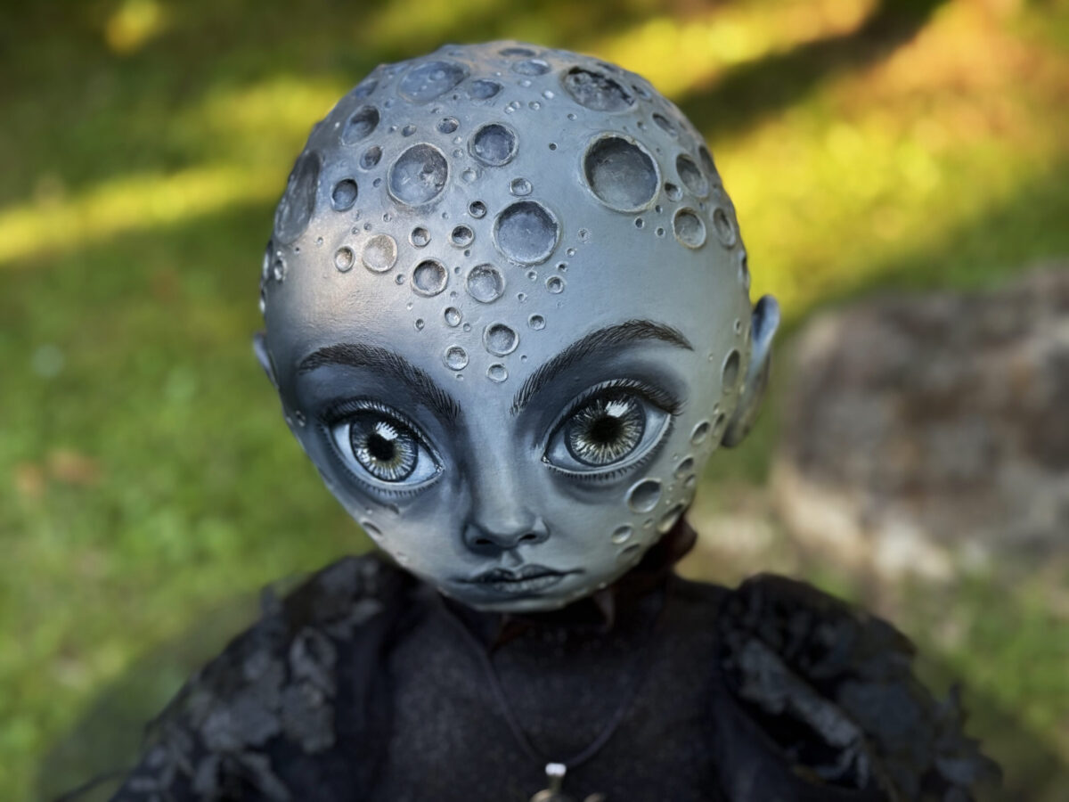 Cabeça esculturada com topografia lunar em relevo, crateras de diferentes diâmetros e bordas suaves. A pintura é monocromática em gradações de cinza, com veladuras nacaradas e toques prateados que acentuam o relevo. Olhos grandes em tons de grafite e pérola dão o brilho frio de plenilúnio. Nas orelhas, um par de safiras lapidadas confere ponto de luz firme.