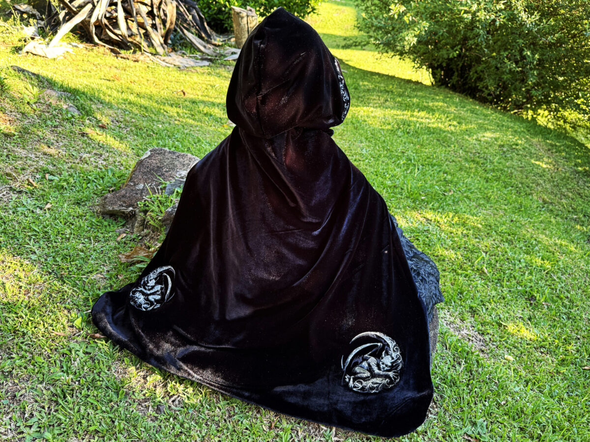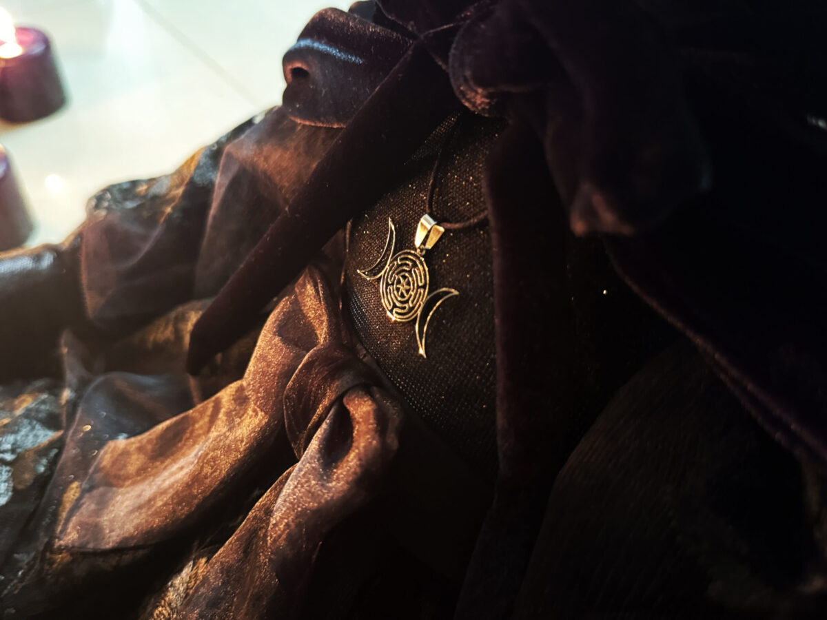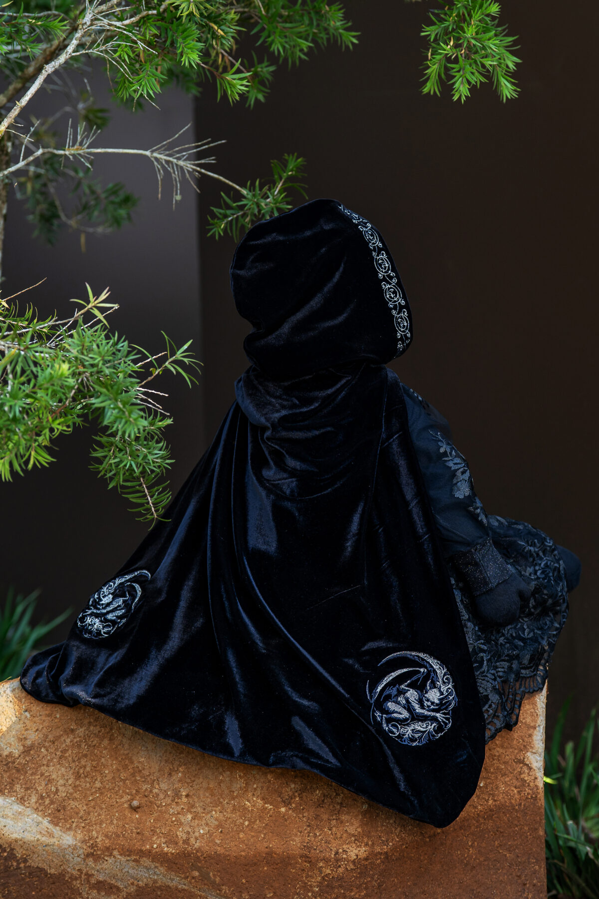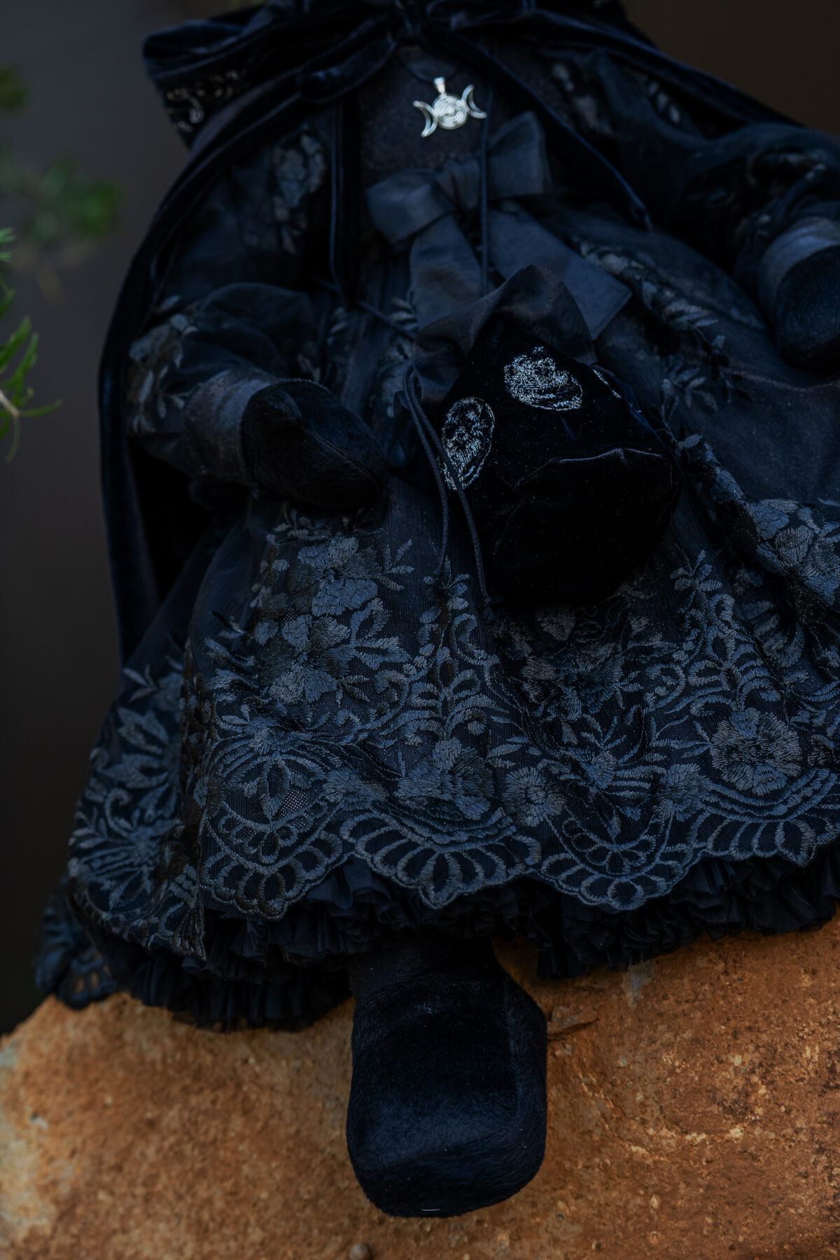 O traje é composto por vestido em renda preta de desenho floral. Por baixo, anágua mantém a arquitetura da saia e cria caimento pleno. Sobre o conjunto, capa de veludo preto com capuz, bordada nas bordas com motivo lunar e fechamento por laço de veludo ao centro. O conjunto acompanha pequena bolsa de veludo com bordado de fases lunares, destinada a resguardar elementos próprios de sua prática.